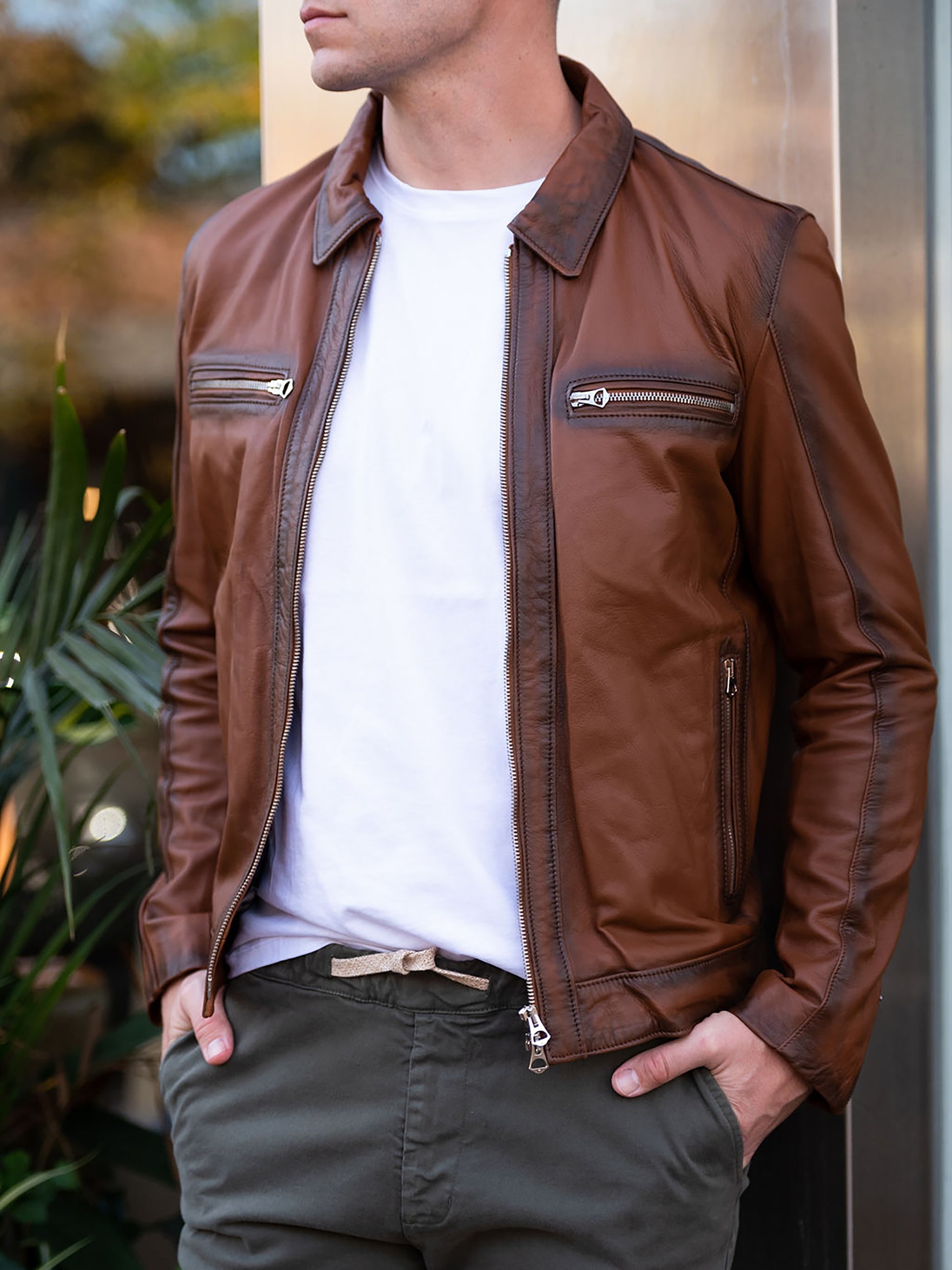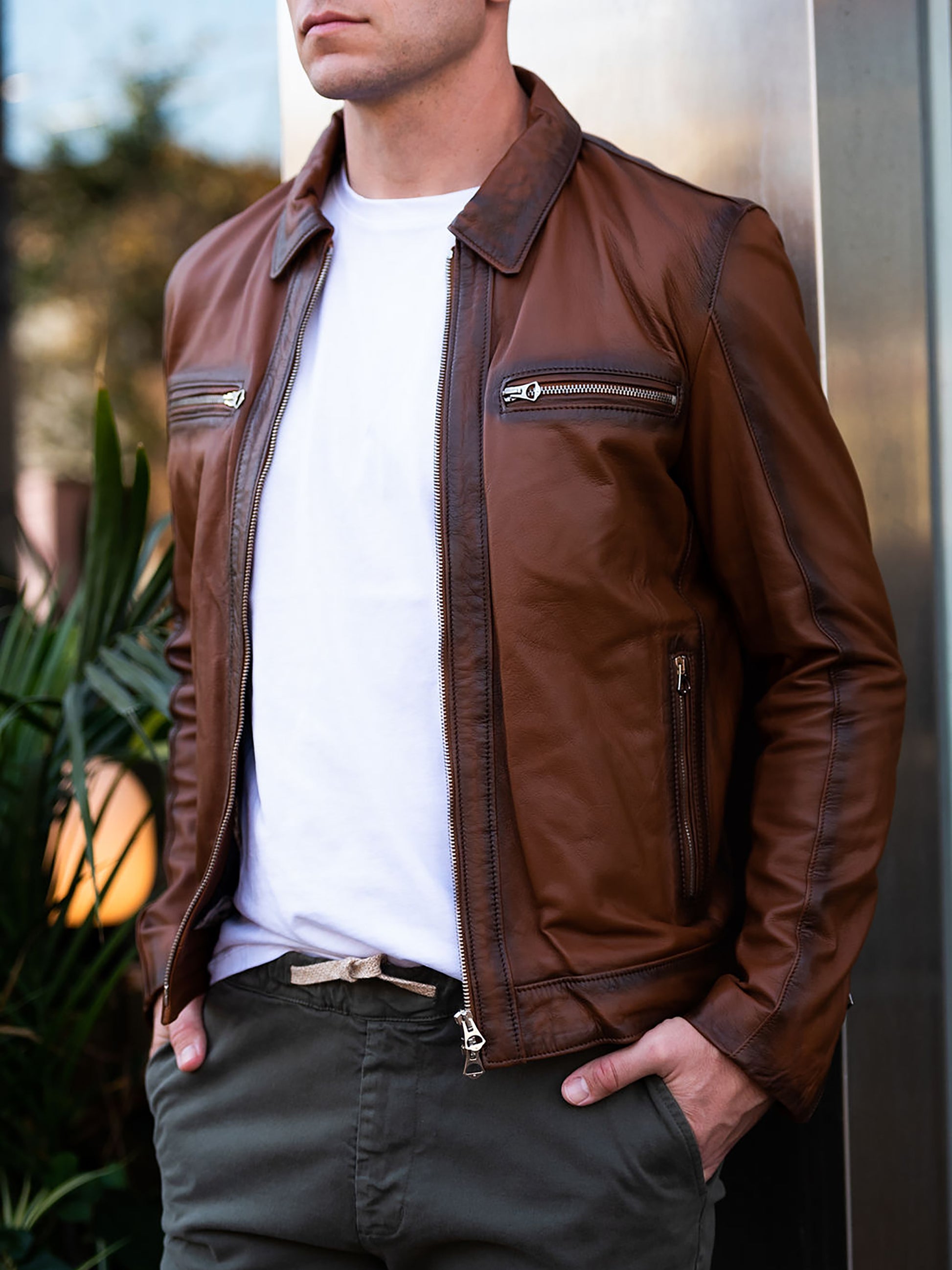 Cette veste présente une silhouette ajustée, des poignets côtelés et une fermeture zippée sur le devant. Sa riche teinte cognac ajoute une touche de sophistication à cette pièce classique, en faisant un choix incontournable pour toute personne à la recherche de style.