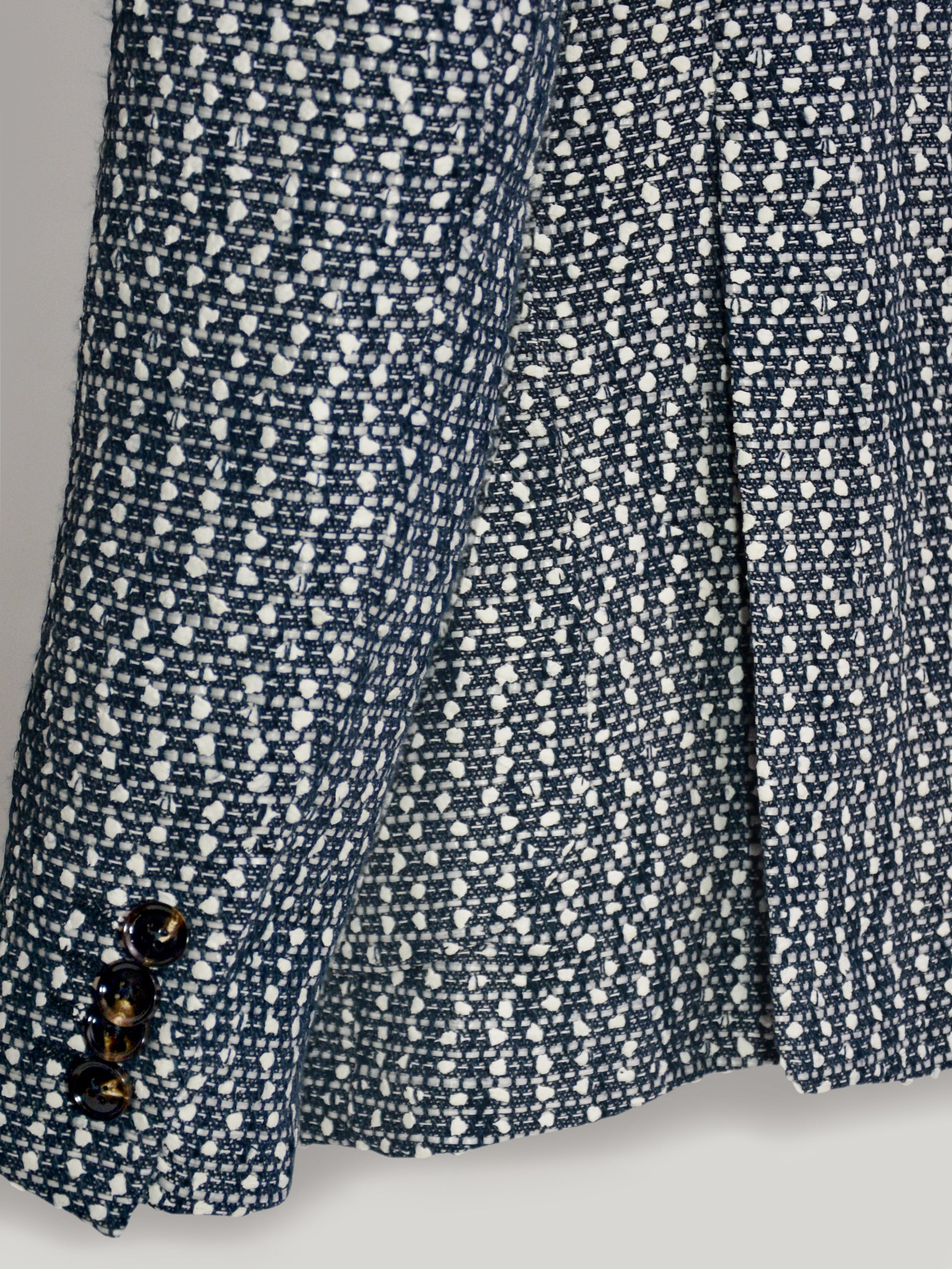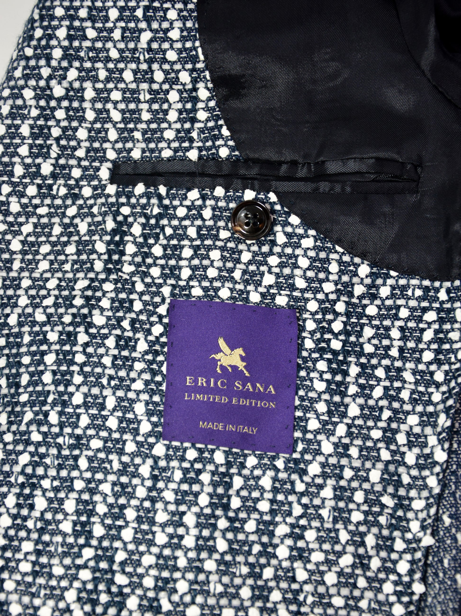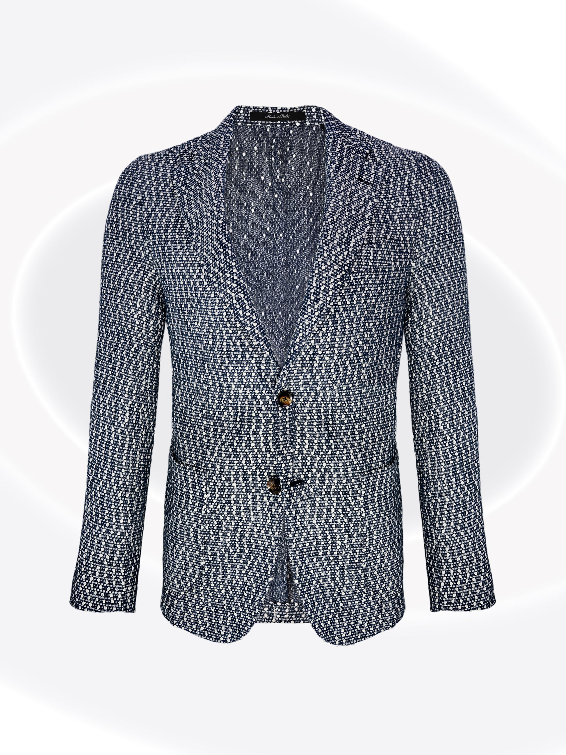 Discover the sophisticated allure of the Giacca Pollini, an Italian-made masterpiece featuring a striking navy foundation adorned with crisp white speckles. This expertly engineered fabric is a mix blend of cotton, viscose, polyamide, and polyurethane for exceptional comfort and durability. The refined silhouette showcases a classic notch lapel, secure 2-button closure, and elegant 4-button cuffs—timeless details that elevate any wardrobe with understated elegance and European craftsmanship.