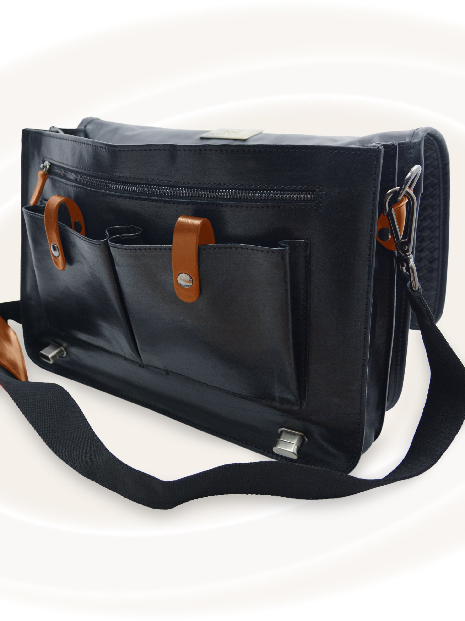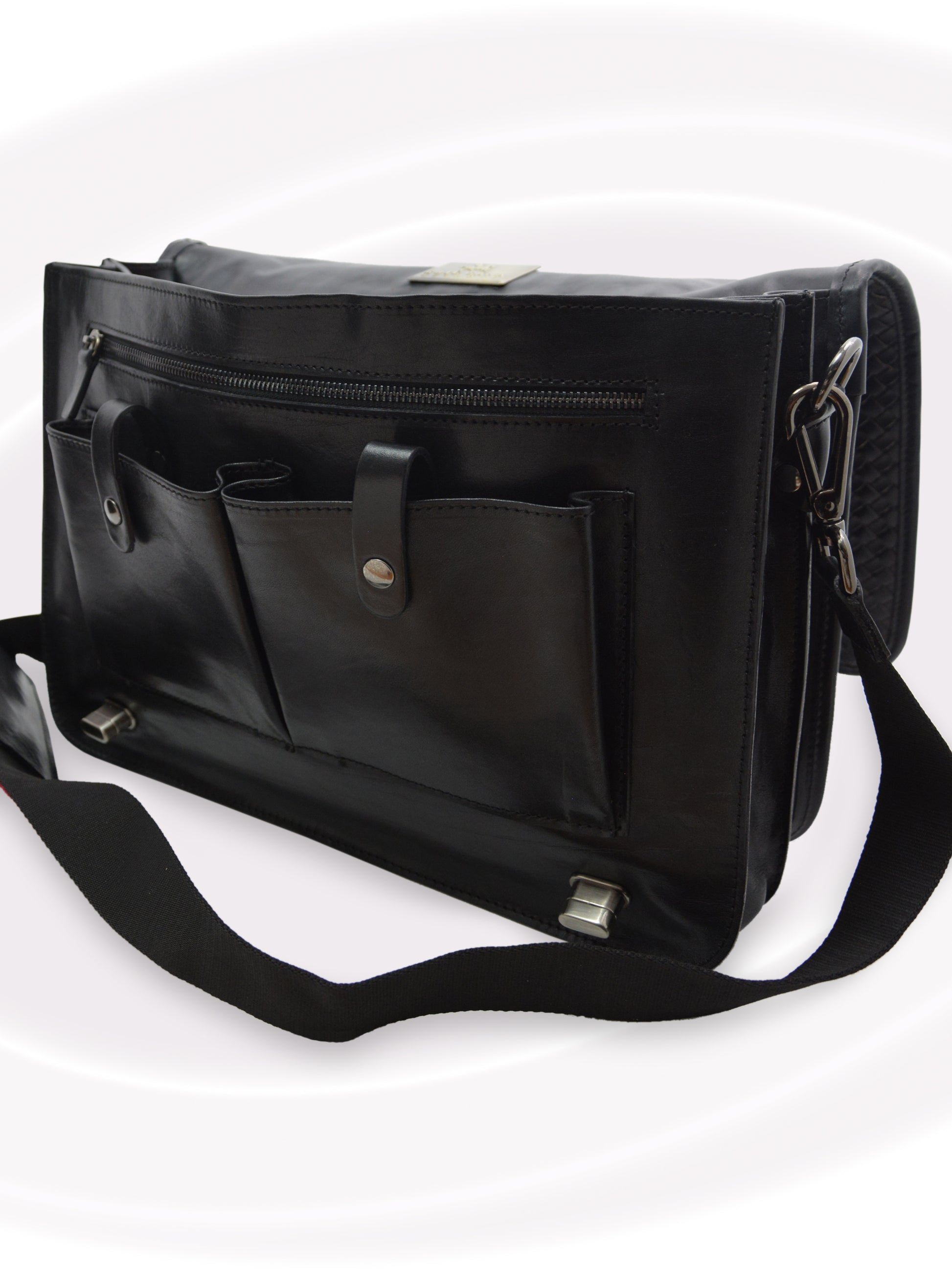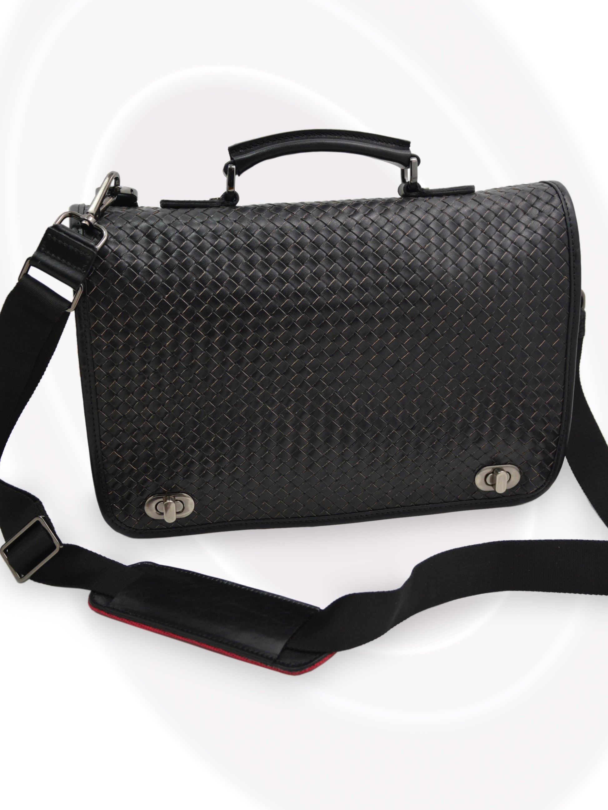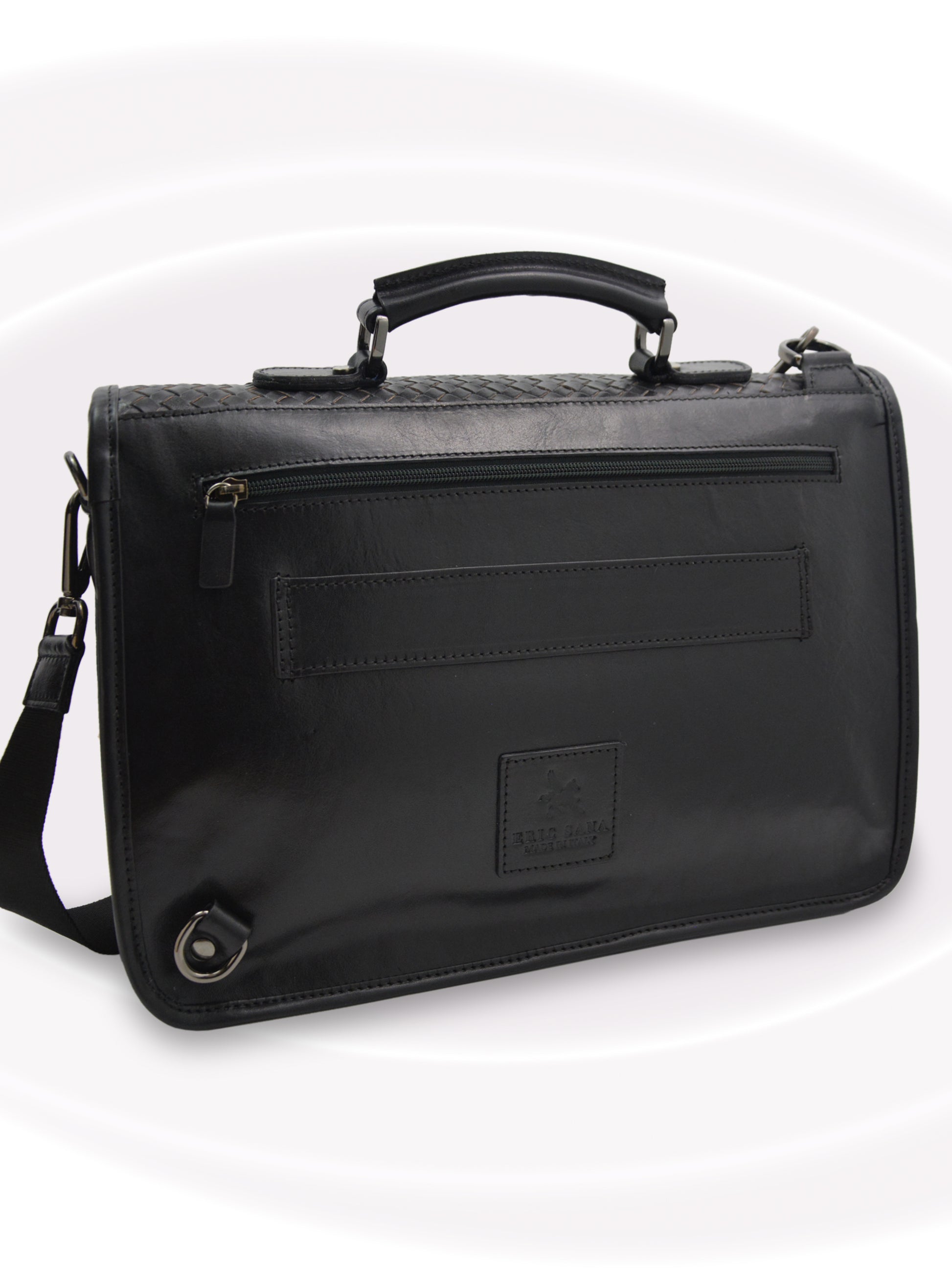 Cette serviette souple Eric Sana est confectionnée en cuir fin tissé à la main selon une technique de tissage complexe vieille de plusieurs siècles. Cet art italien ancestral d'entrelacement de bandes de cuir lui confère une intégrité exceptionnelle. L'intérieur doublé de textile rouge cramoisi présente une double cloison, deux poches dans chaque compartiment et des poches extérieures zippées de chaque côté. Le rabat dissimule deux poches boutonnées pour téléphones portables et autres accessoires. Cette serviette souple Eric Sana allie design et fonctionnalité. Assez grande pour accueillir un ordinateur portable, elle est ergonomique et dotée d'une bandoulière rembourrée au milieu pour un transport aisé.