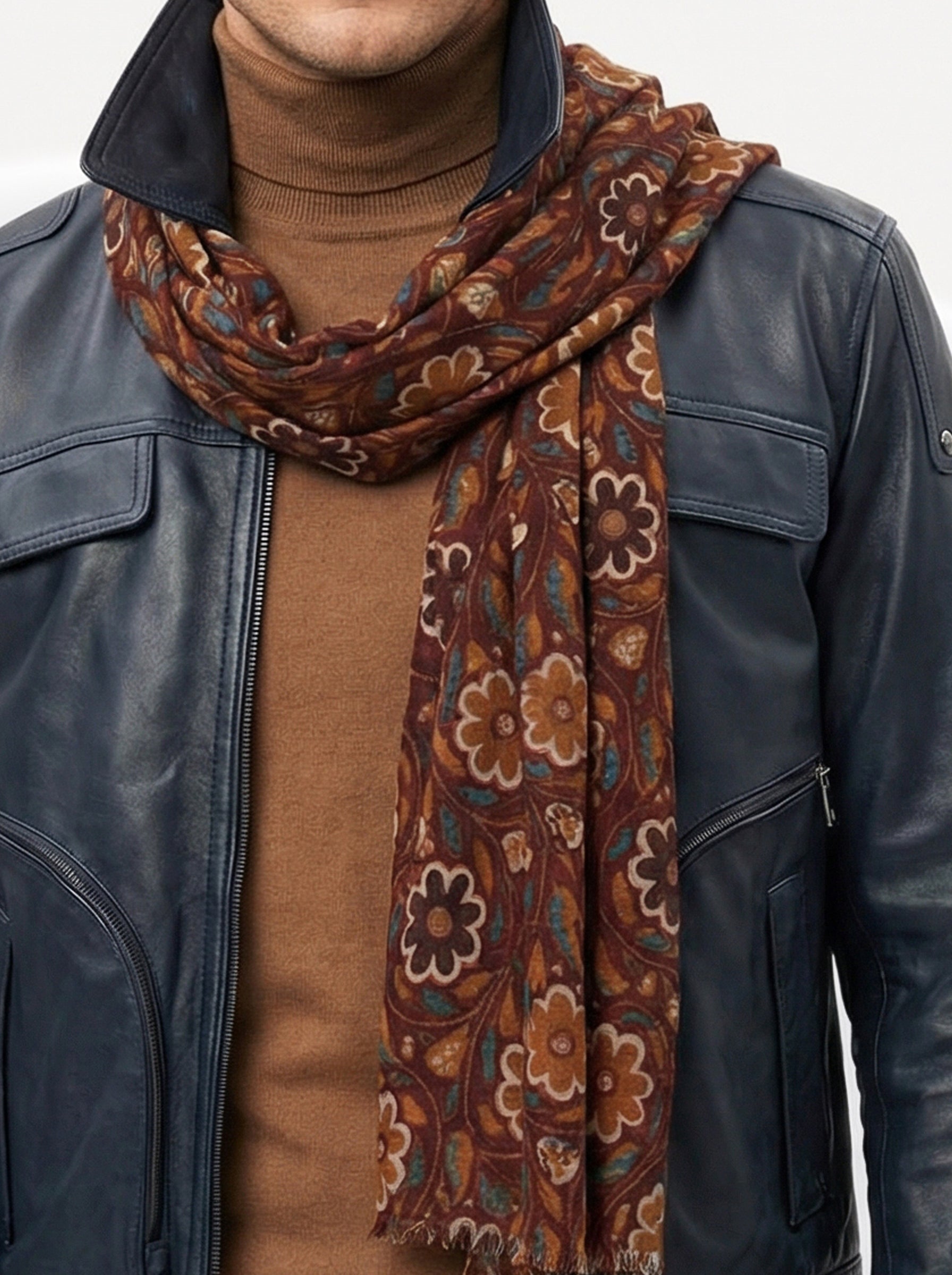 Queste sciarpe in cashmere hanno un aspetto lussuoso ed elegante, con motivi intricati e colori intensi. I design includono motivi paisley, geometrici e floreali, con un mix di blu intenso, oro caldo e tonalità bordeaux.