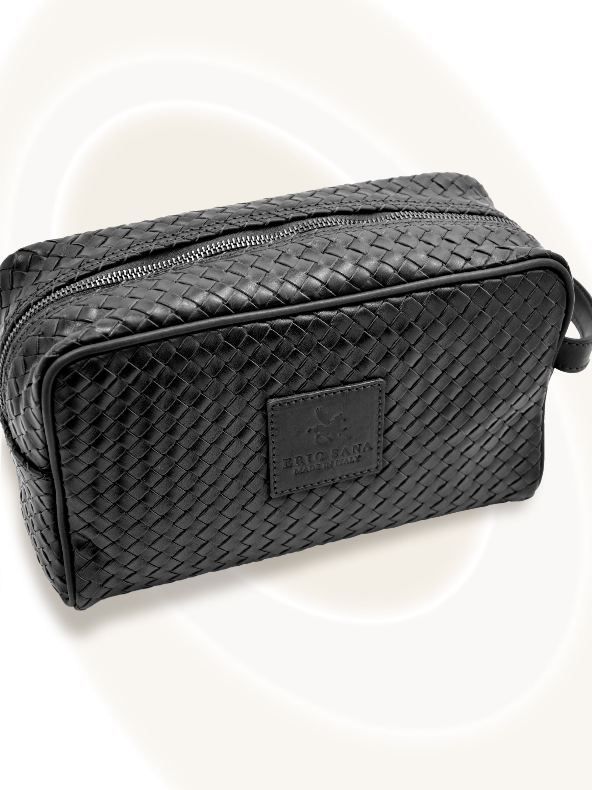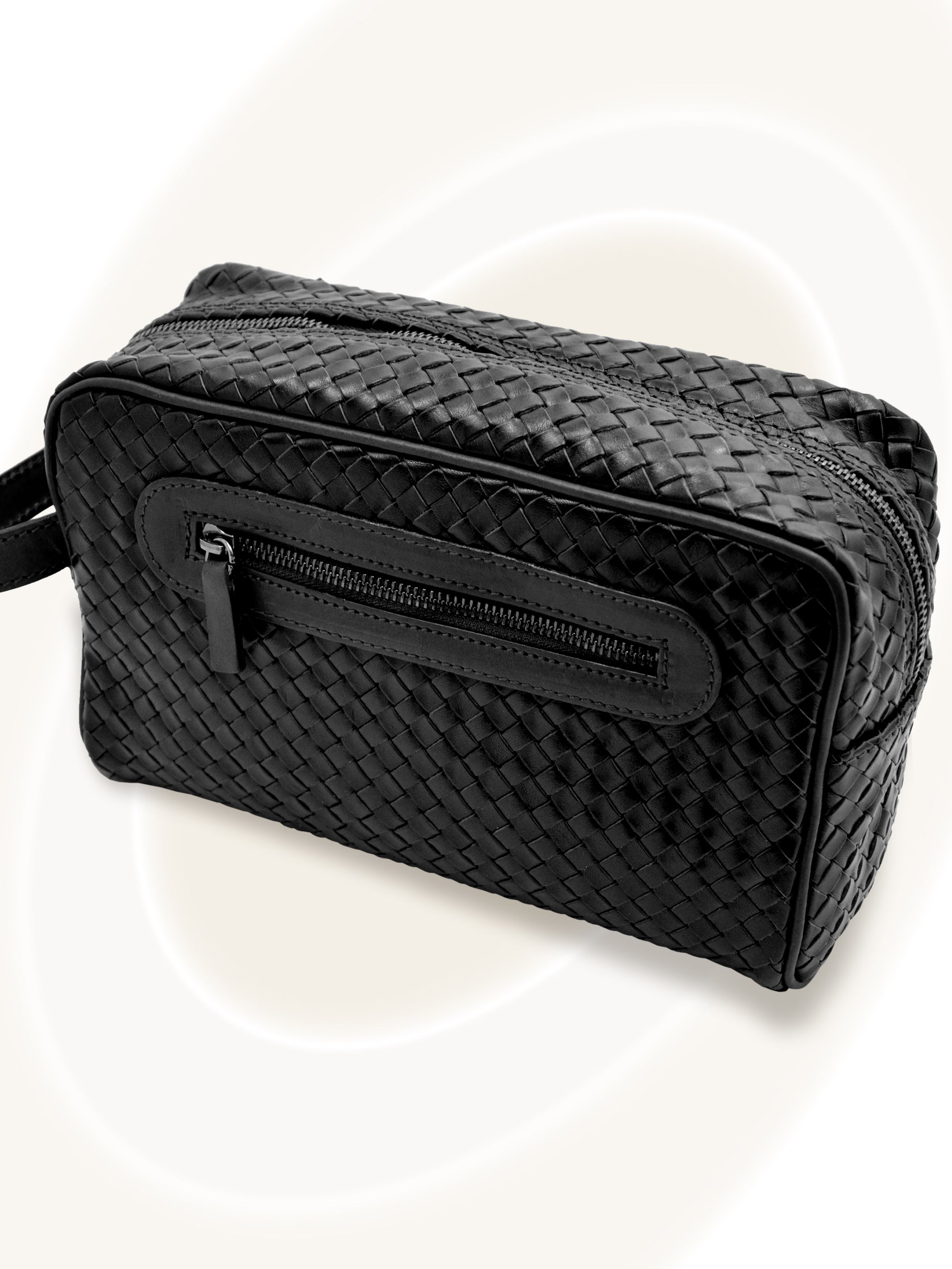 Questa borsa da toilette da viaggio è realizzata con l'eleganza superiore della pelle pregiata intrecciata a mano con la secolare tecnica classica dell'intrecciato. Ciò garantisce la durevolezza dell'intreccio rendendo questo prodotto immensamente utile per il gentiluomo in viaggio. La fodera in tessuto Crimson e gli interni spaziosi accolgono i prodotti da toeletta con stile. Disponibile in Ebony Black e Ebony Black con profili marroni. Da portare a mano, stile pochette.