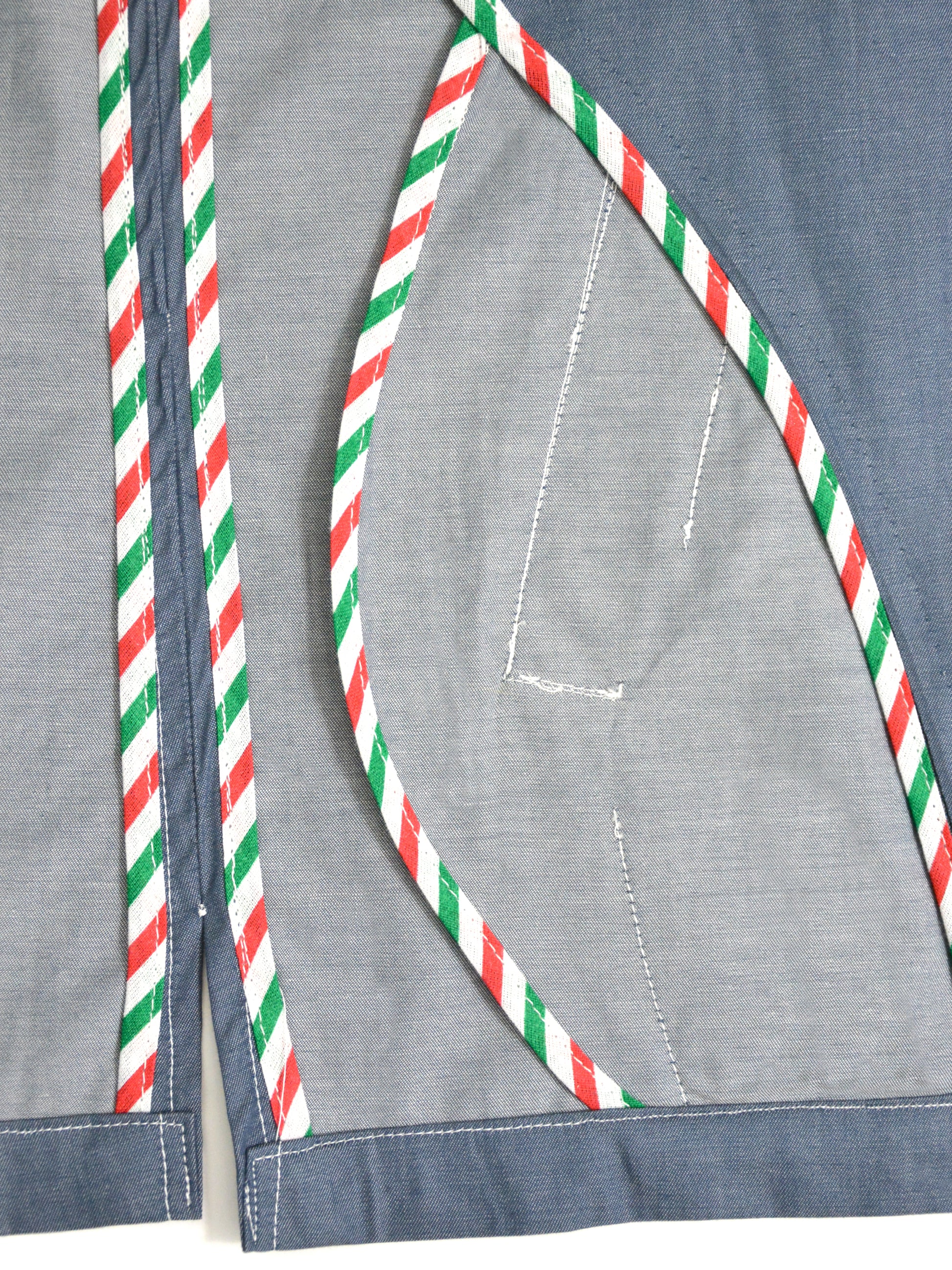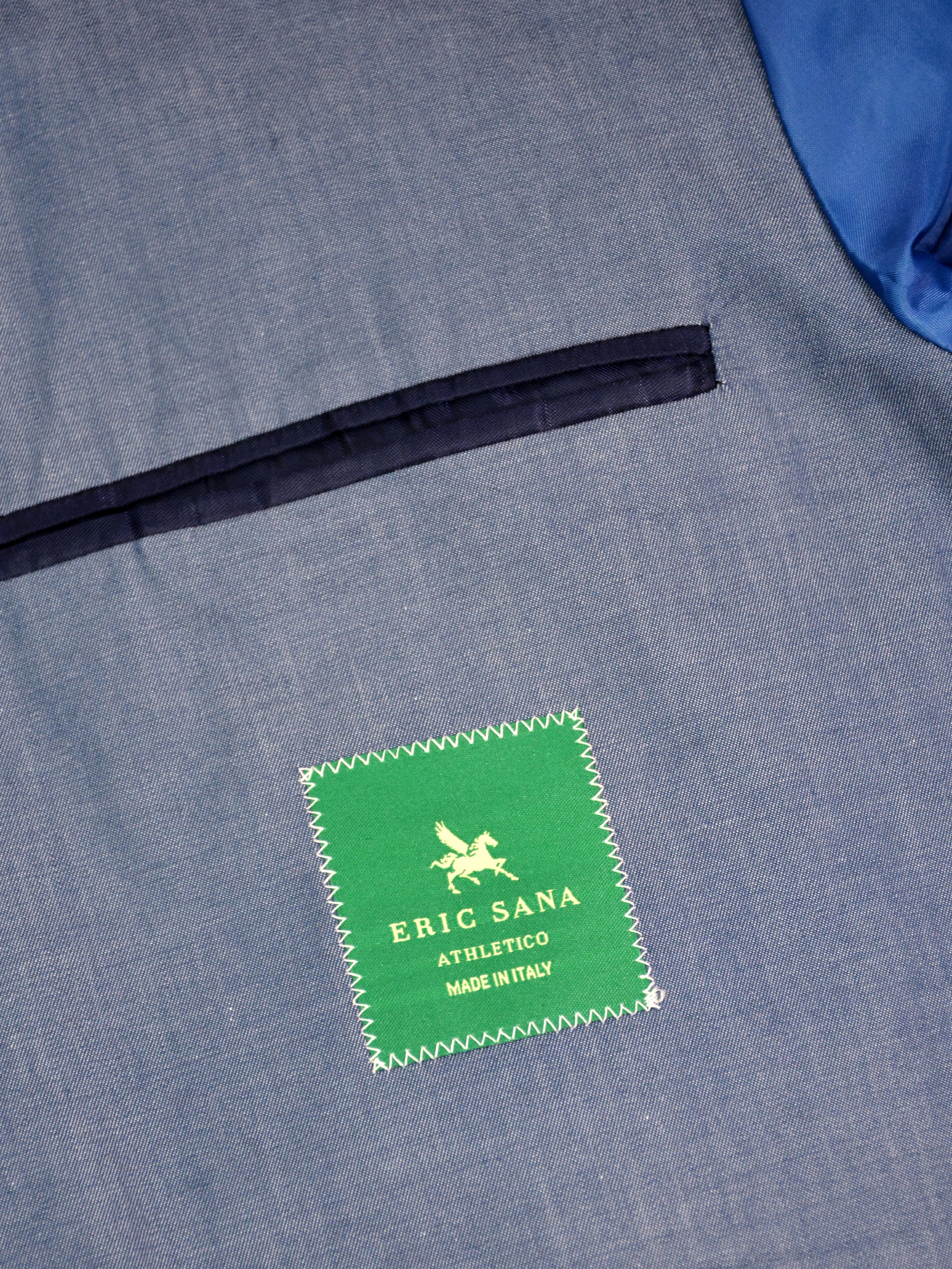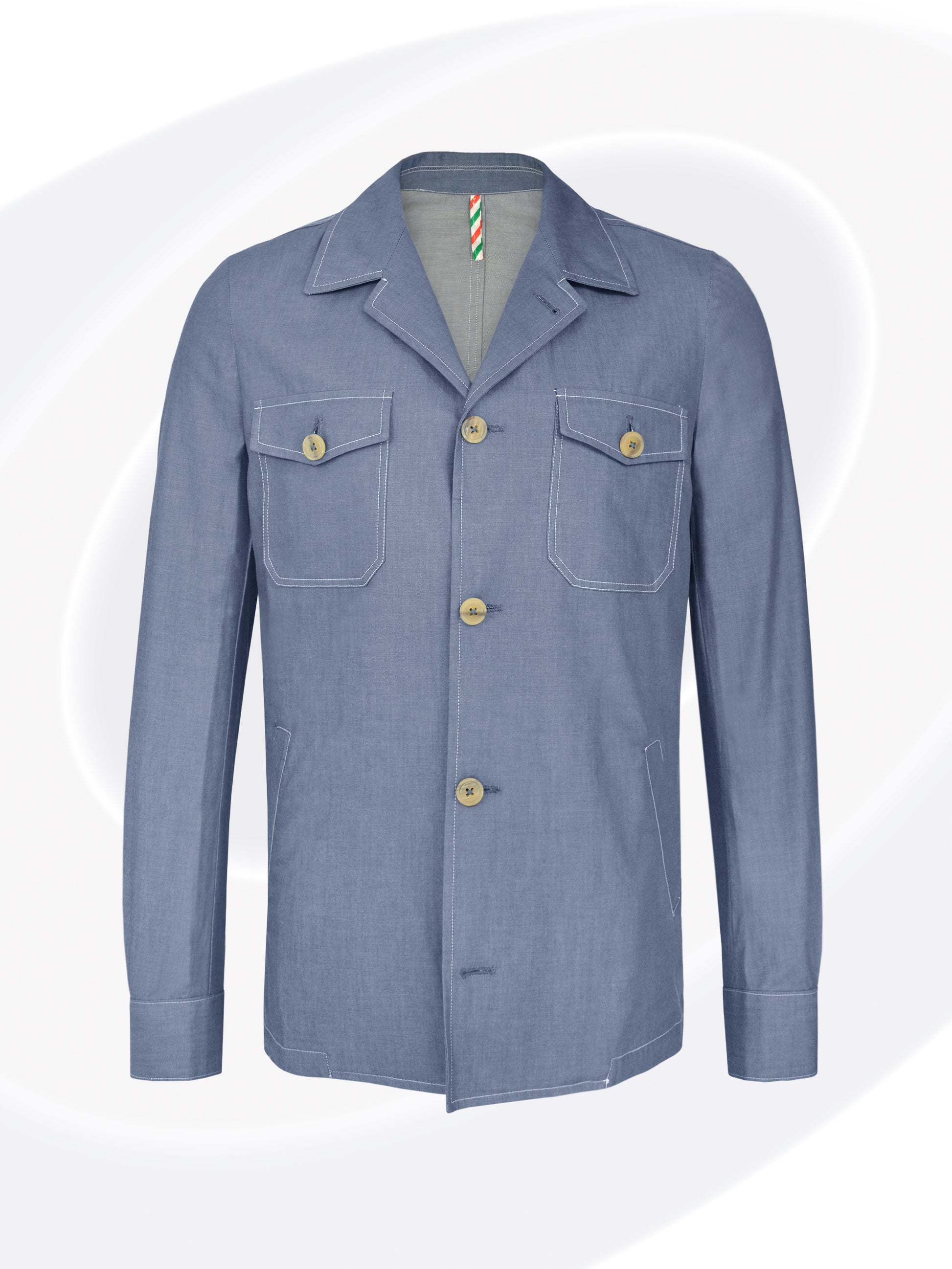 This cotton lightweight fabric appears to be a workwear or safari style blazer. It has a structured yet casual design with a notched lapel, patch pockets with buttoned flaps, and visible contrast stitching. The light coloured buttons complementing the faded blue/gray blue tone of the fabric. This style blends elements of classic work jackets and casual blazers, making it versatile for both causal and semi-formal wear.