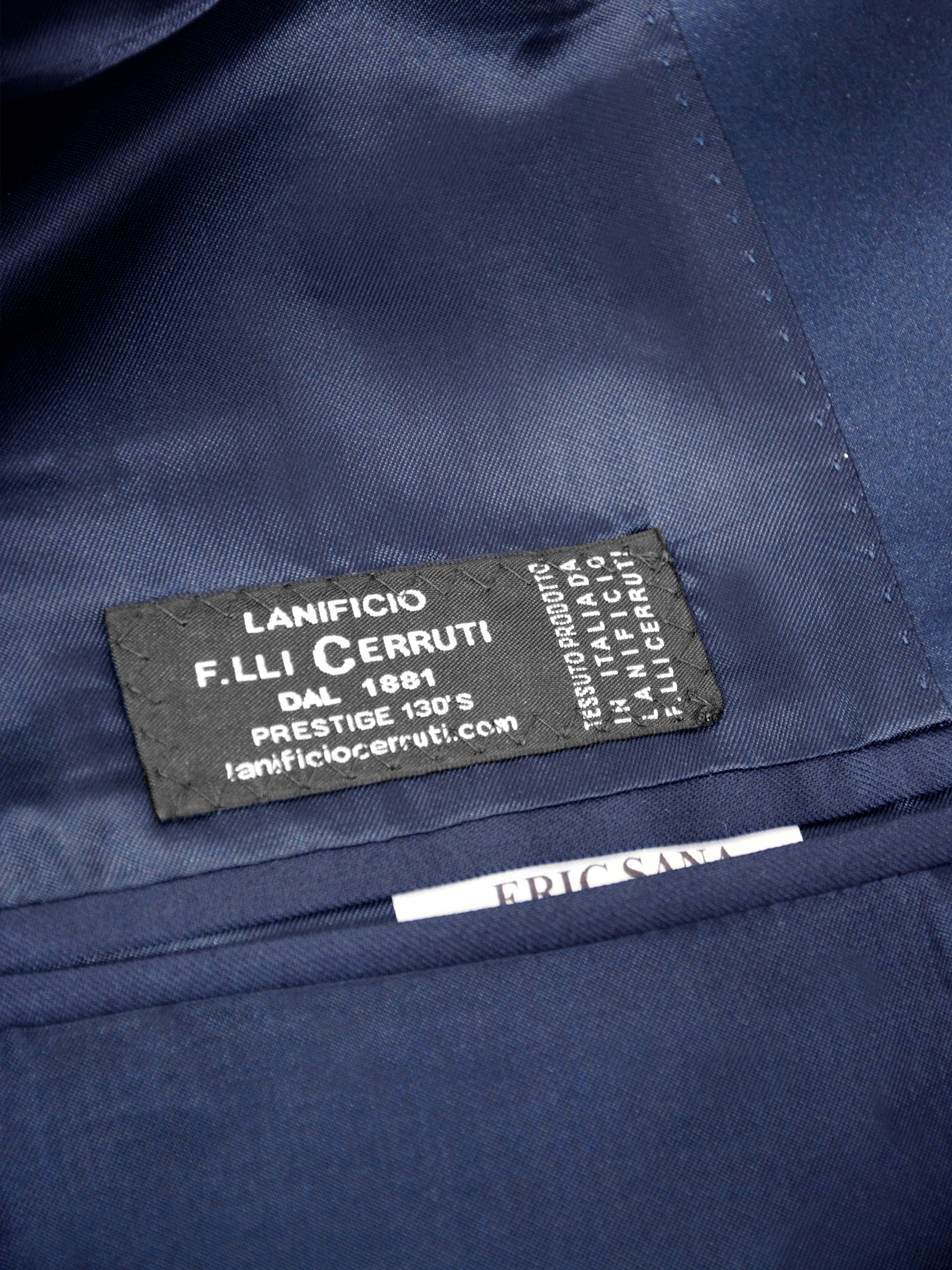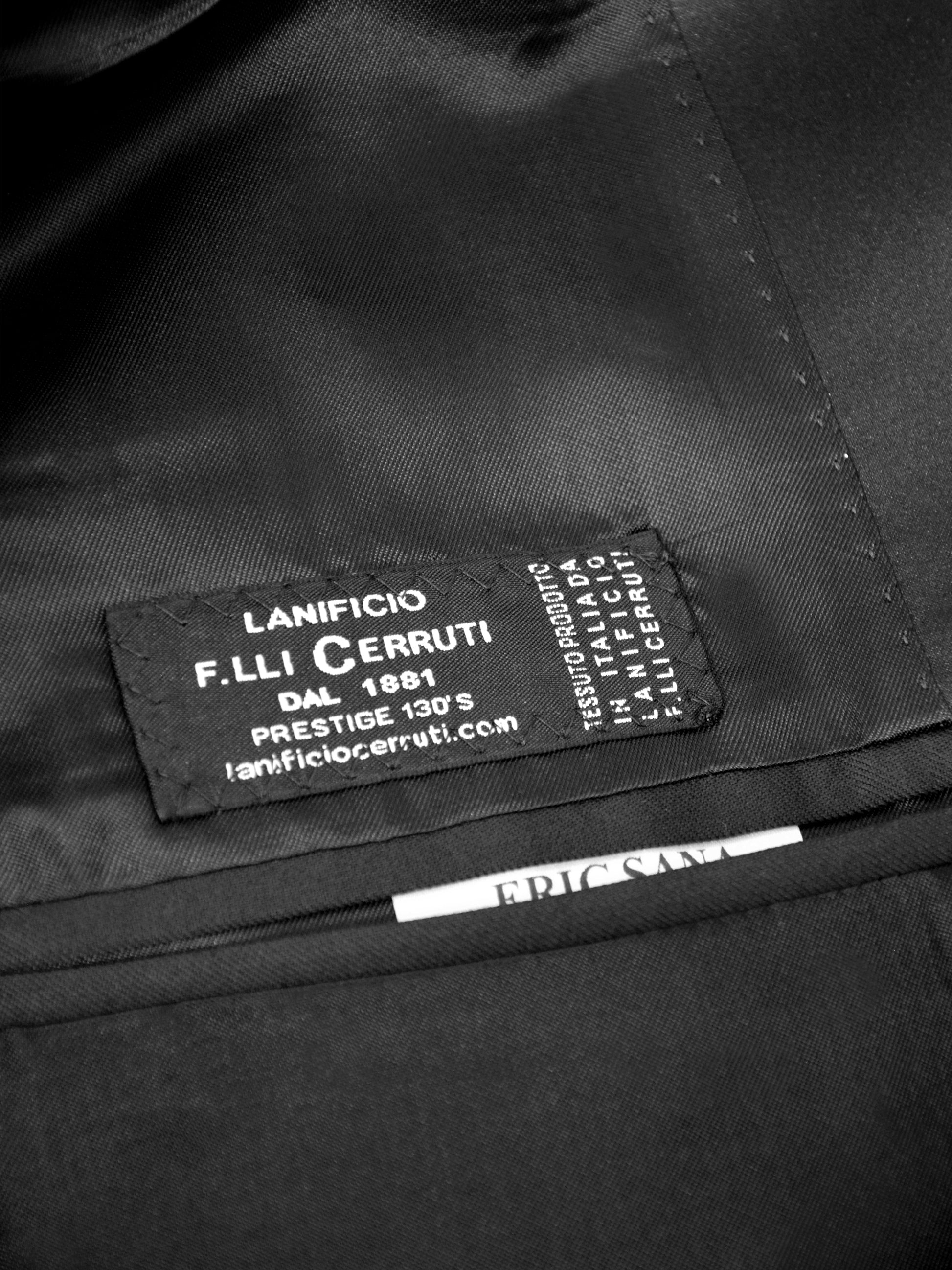 This Cerruti Tuxedo exudes elegance and sophistication. It is crafted from high quality virgin wool, featuring a sleek satin peak lapel that enhances its formal appeal. The jacket has a well-structured silhouette with a single-button closure and welt pockets for a classic refined look. Inside the tuxedo is lined with smooth material for comfort and a label confirms its Italian craftsmanship. The matching trousers have a traditional design.