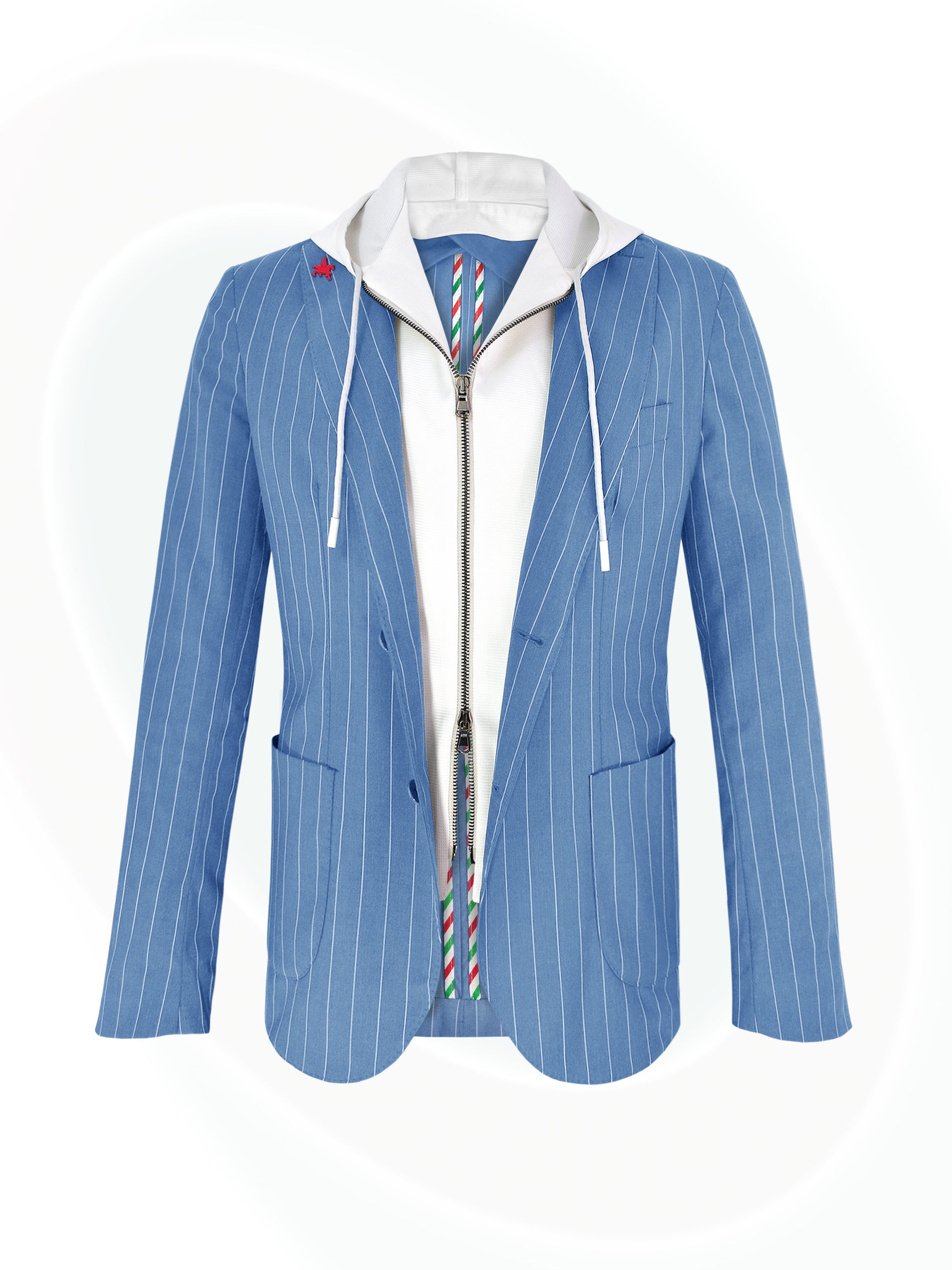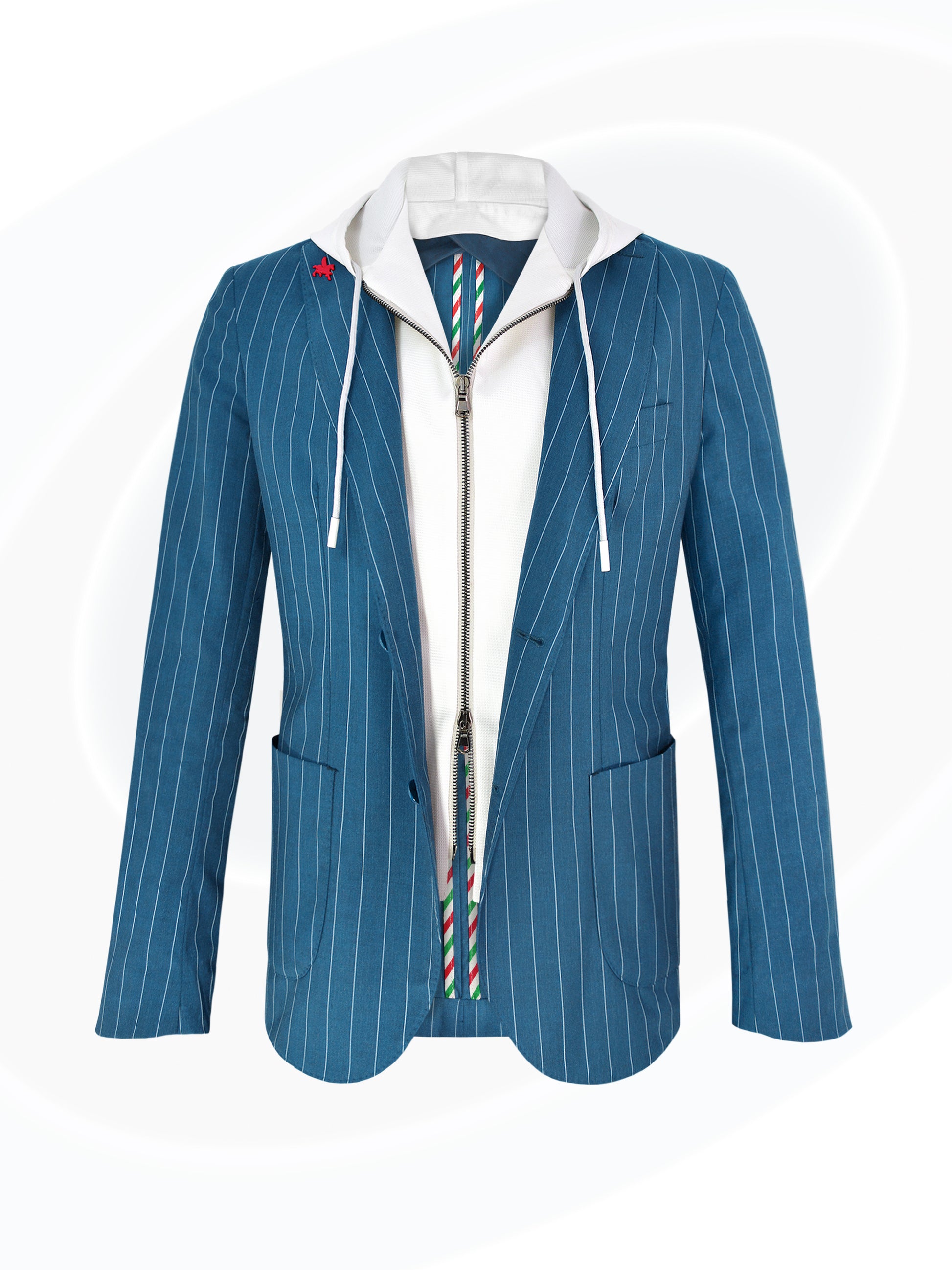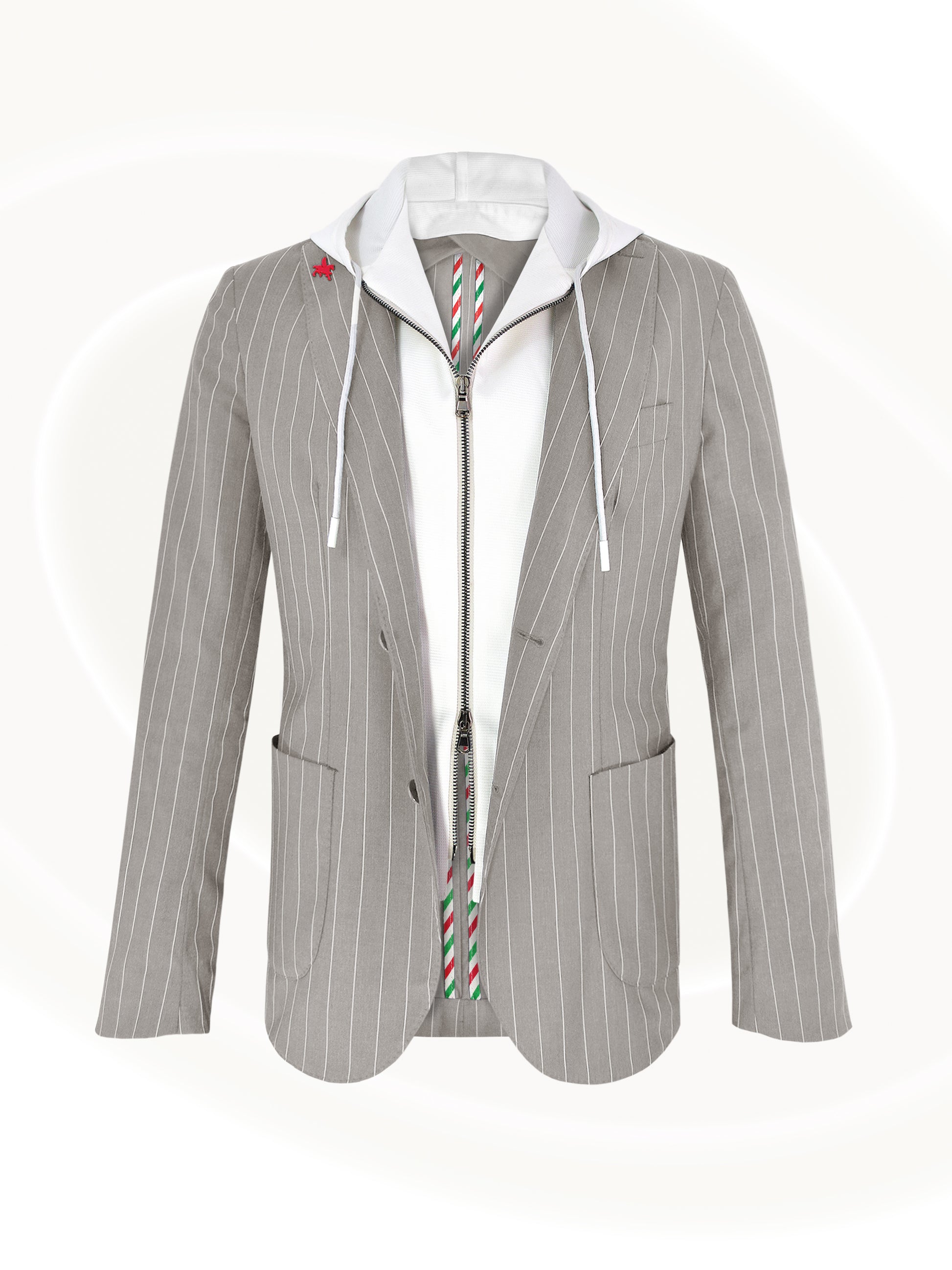 This Classic Pinstripe Hoodie combines traditional tailoring with contemporary comfort. This innovative Italian-crafted piece features the refined elegance of a pinstripe blazer seamlessly integrated with a casual hoodie element.