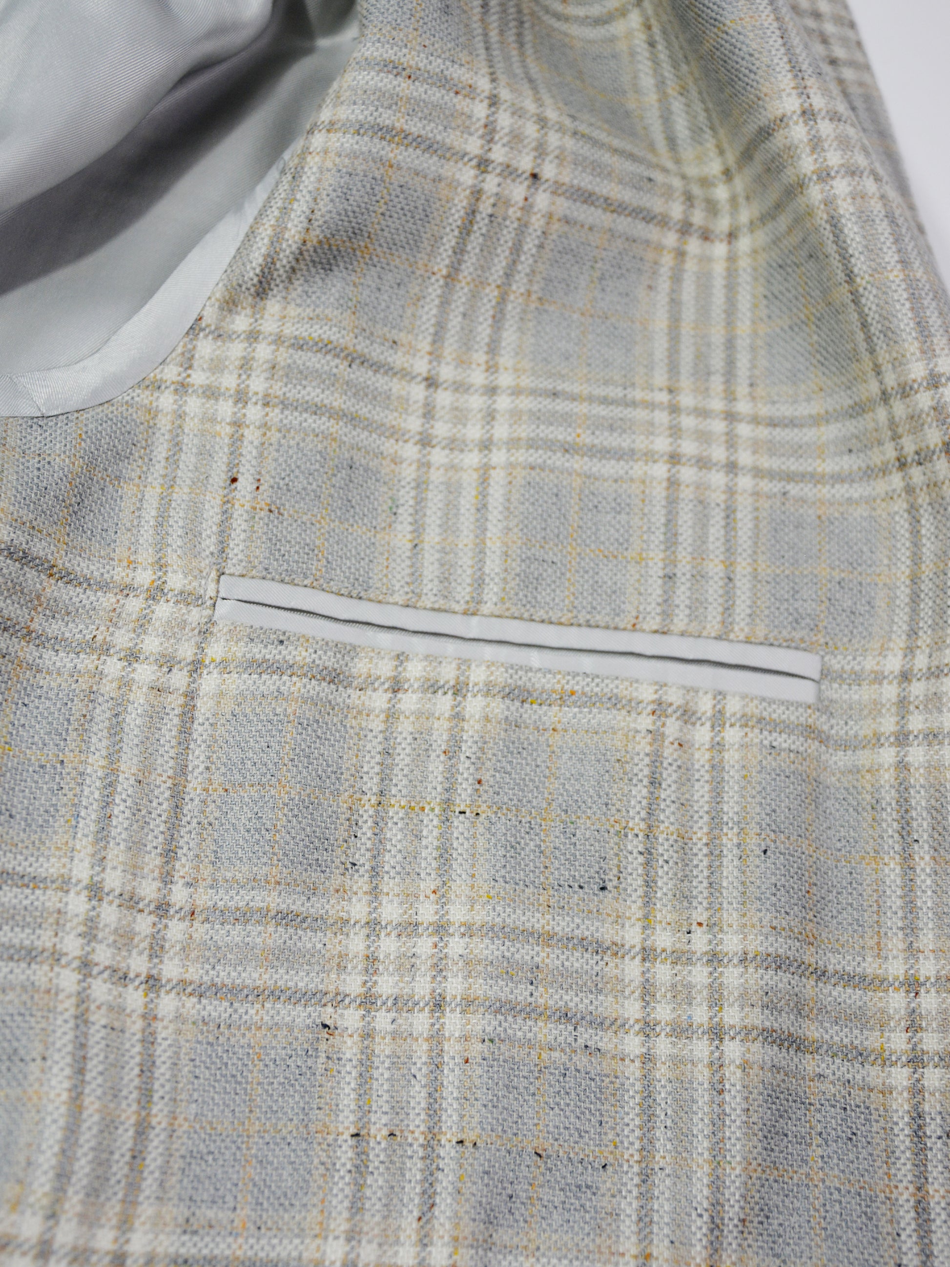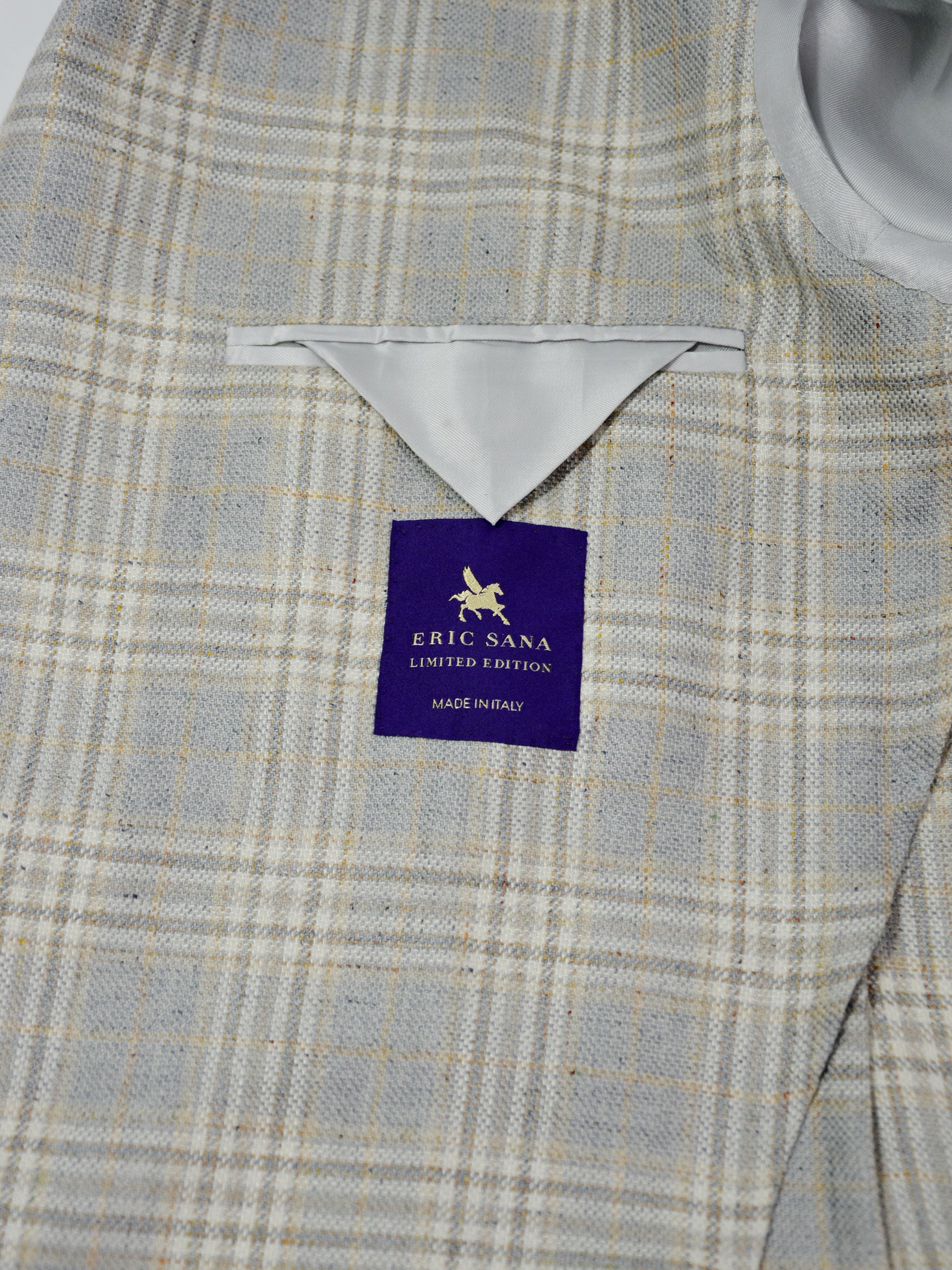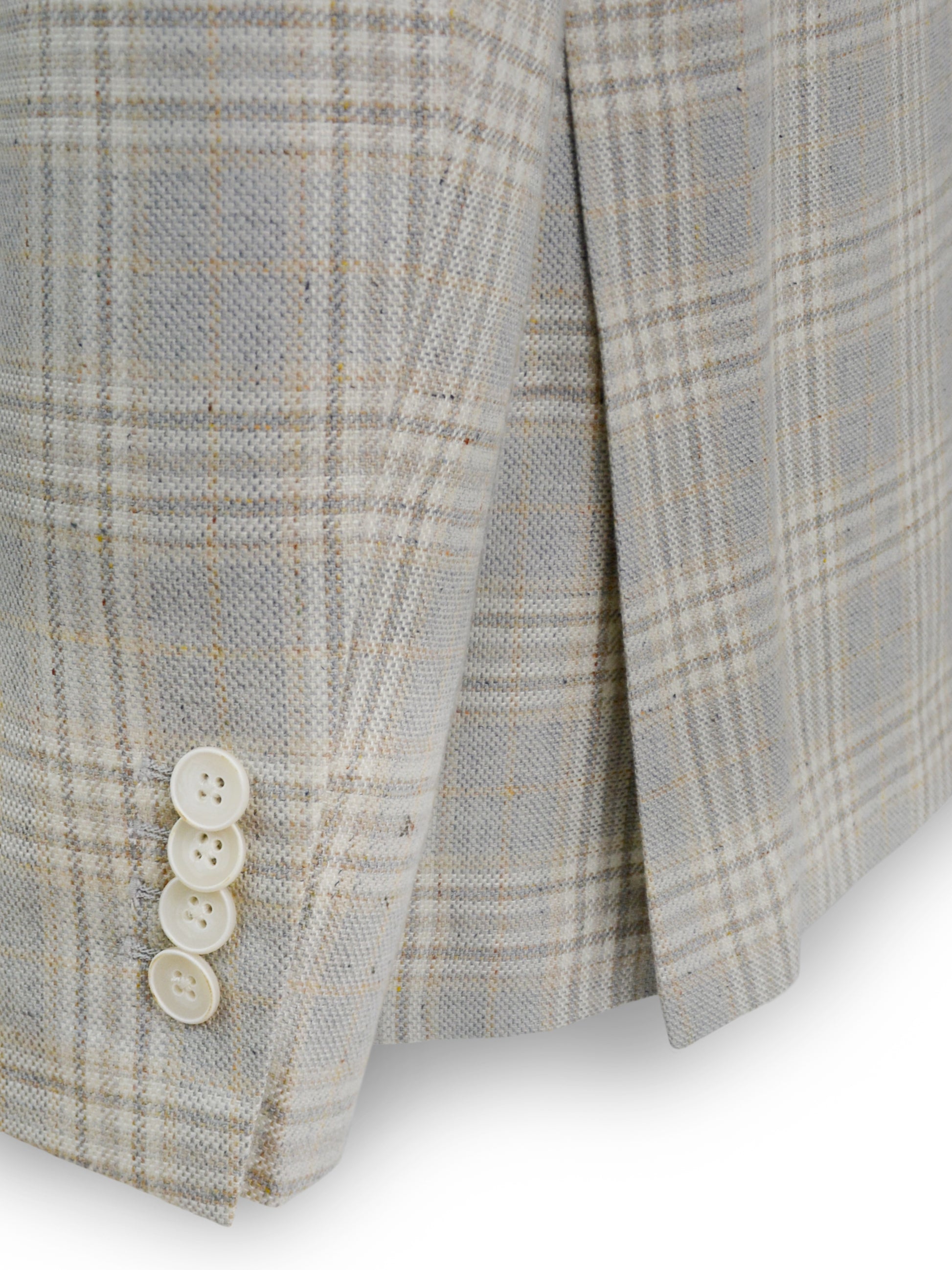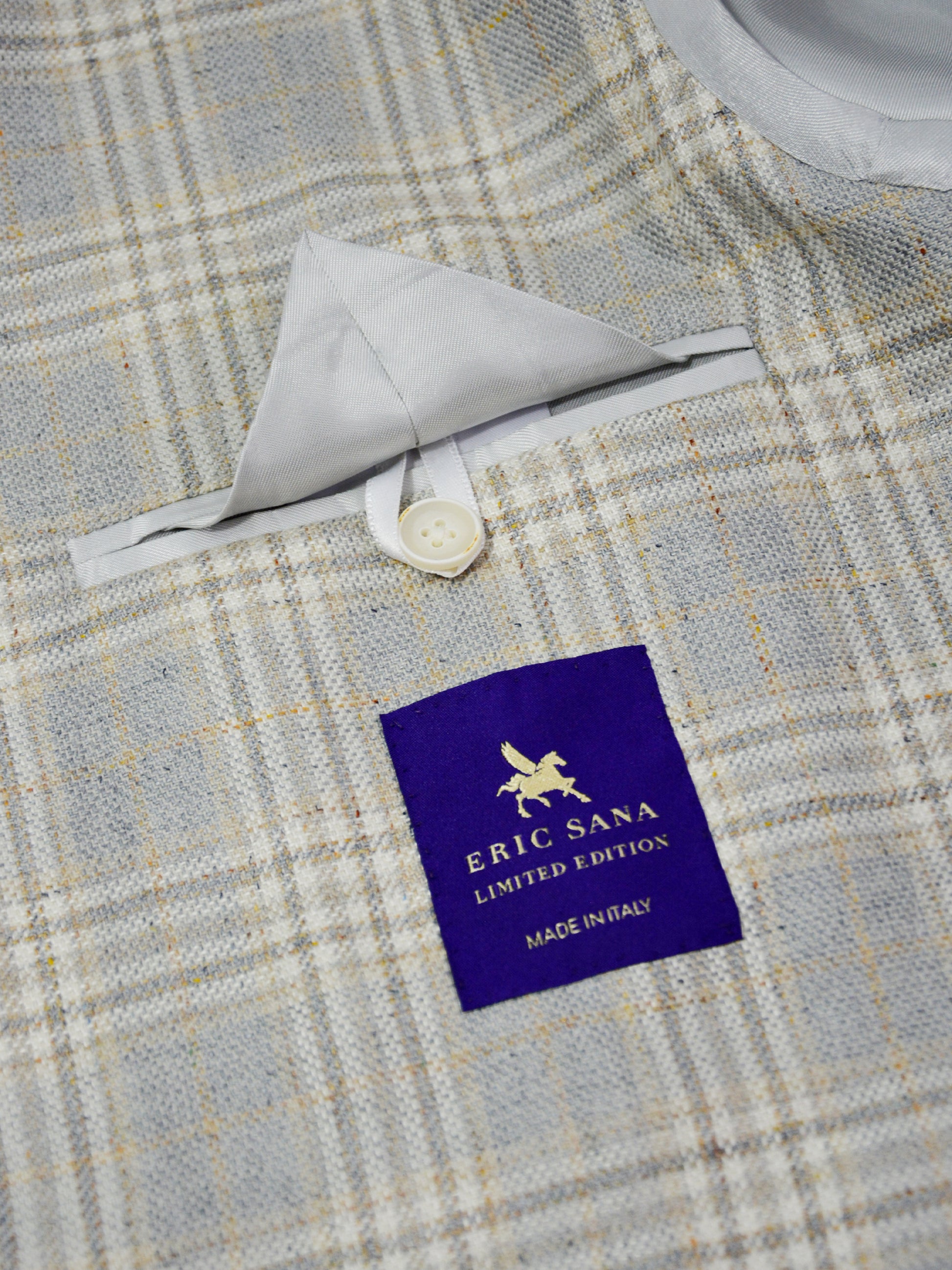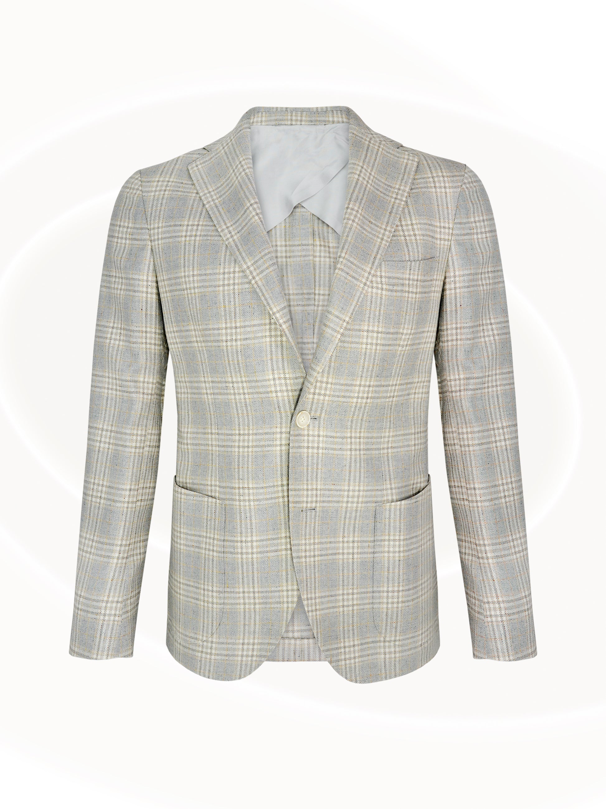 The Giacca Napolitano embodies timeless sartorial elegance with its refined silhouette and meticulous craftsmanship. This distinguished blazer features delicate pale tones adorned with the classic Glen Plaid pattern—also known as Prince of Wales check—creating an air of understated sophistication. The exquisite blend of silk and virgin wool offers a luxurious hand-feel with natural temperature regulation and exceptional drape that maintains its pristine appearance throughout the day. Masterfully tailored in Italy, this blazer showcases the hallmark characteristics of traditional Neapolitan tailoring: a softly constructed shoulder, gentle lapel roll, and subtle waist suppression that creates a flattering silhouette. The versatility of this piece makes it an exemplary choice for daytime soirées, summer nuptials, or elevating one's professional wardrobe. The Giacca Napolitano represents the perfect balance between formal structure and relaxed elegance—a quintessential addition to the discerning gentleman's collection who appreciates subtle pattern work and impeccable Italian craftsmanship.