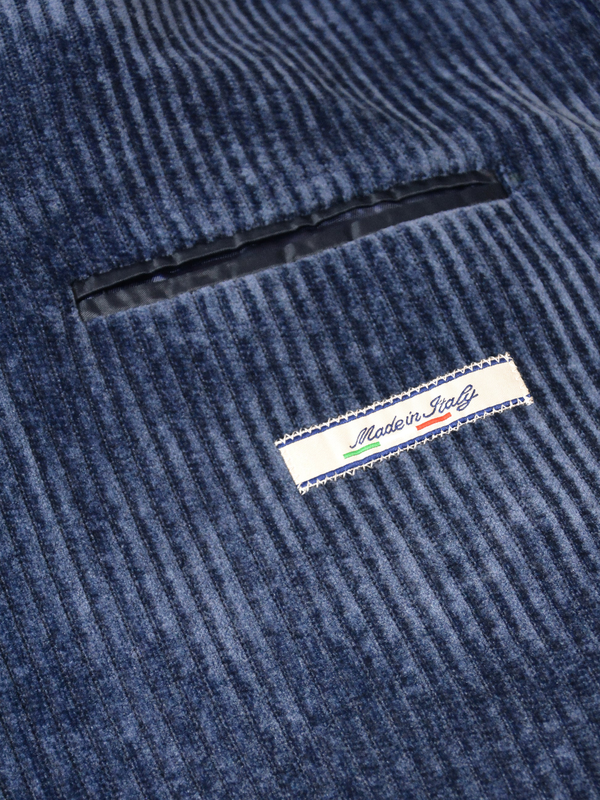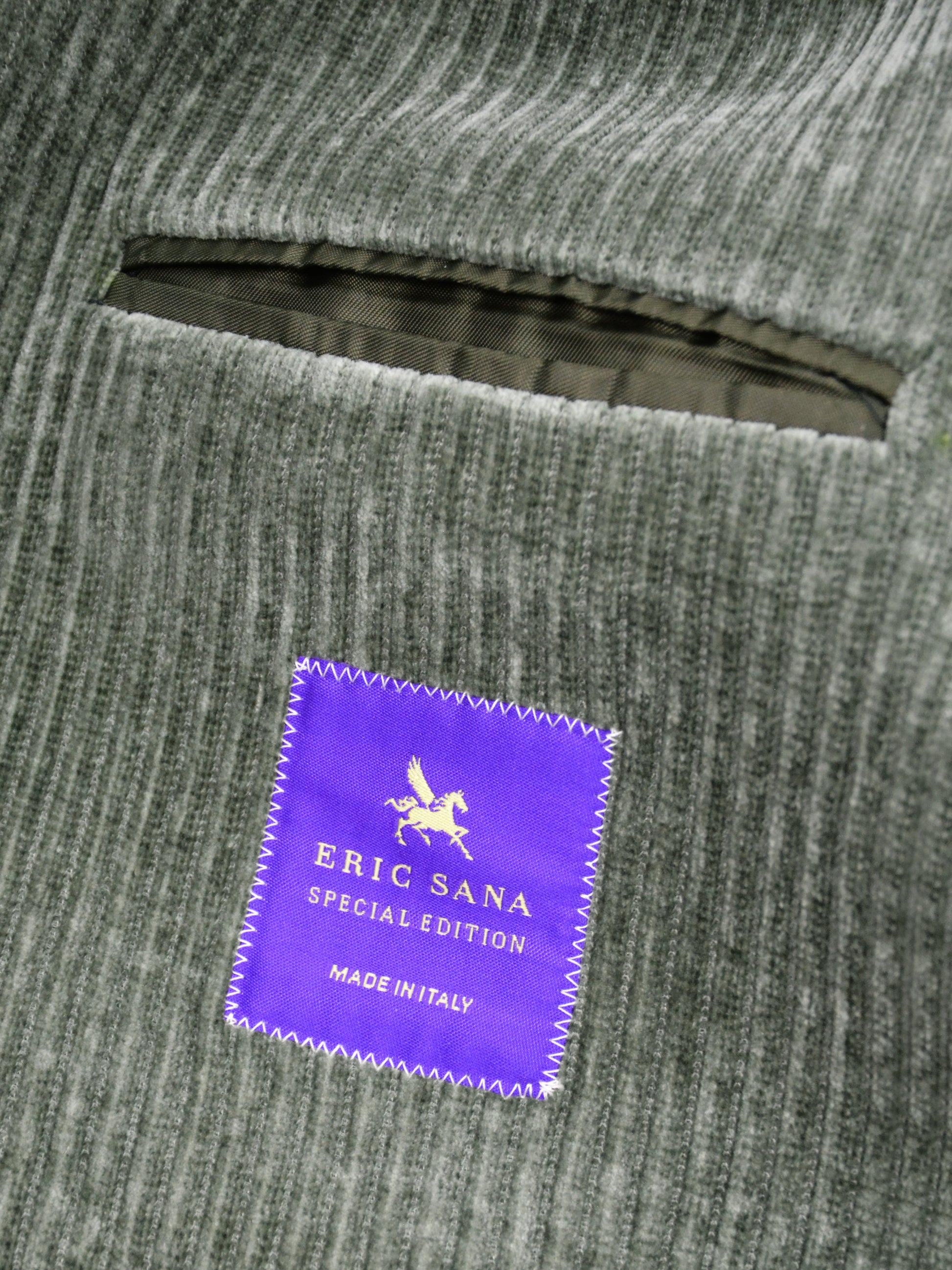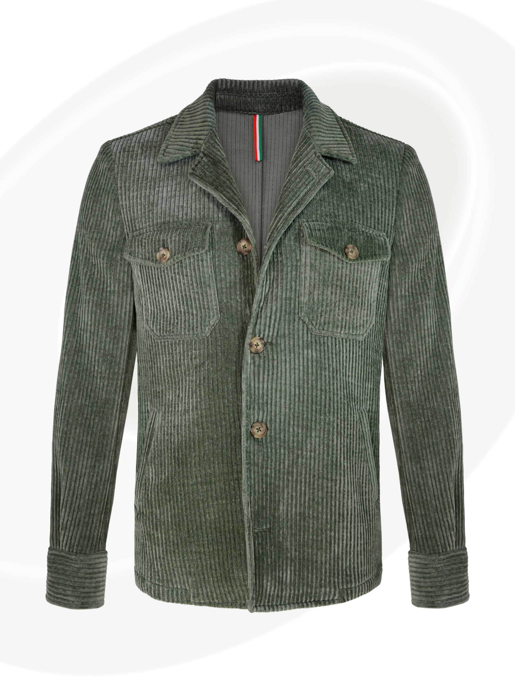This stylish corduroy jacket Made in Italy - is a vintage inspired utility or safari style design. The fabric is a soft, ribbed corduroy in a muted sage green (salvia) and blue gray (nimbus) colour, giving it a rich texture and a slightly rugged yet sophisticated look.It has a tailored structure with a notched lapel, four button front closure and two buttoned chest pockets with flap closures, adding a functional and military-style aesthetic.