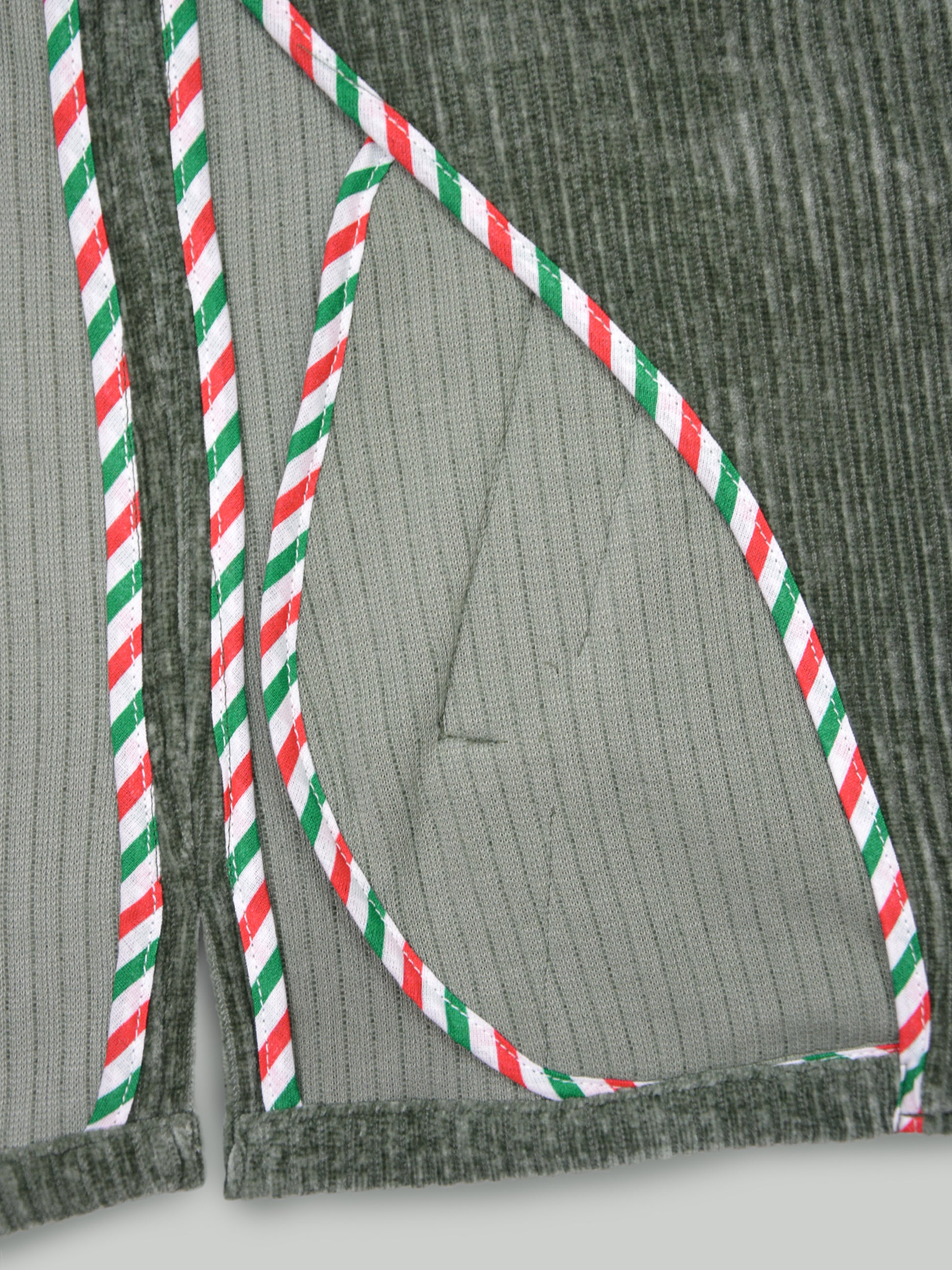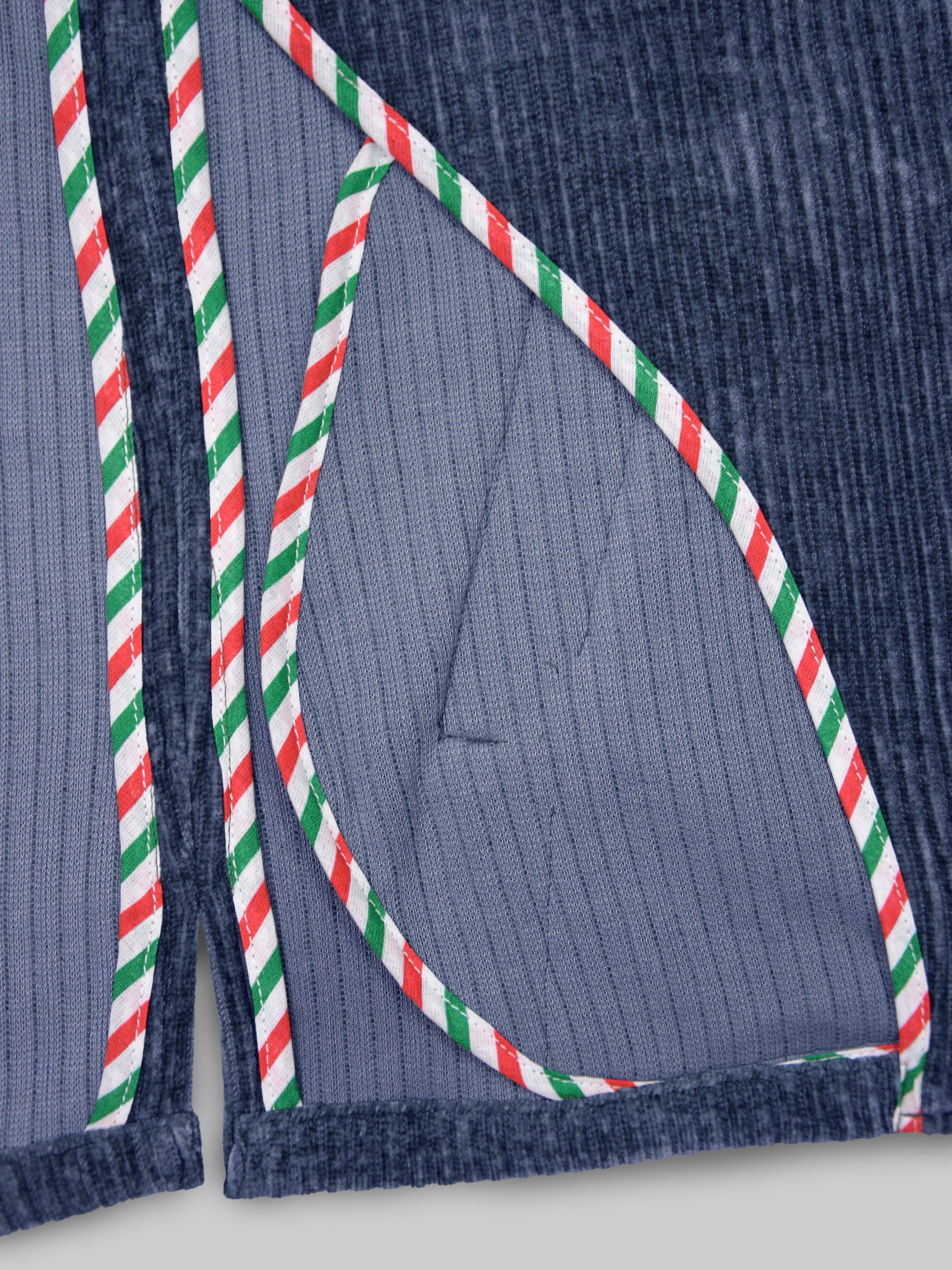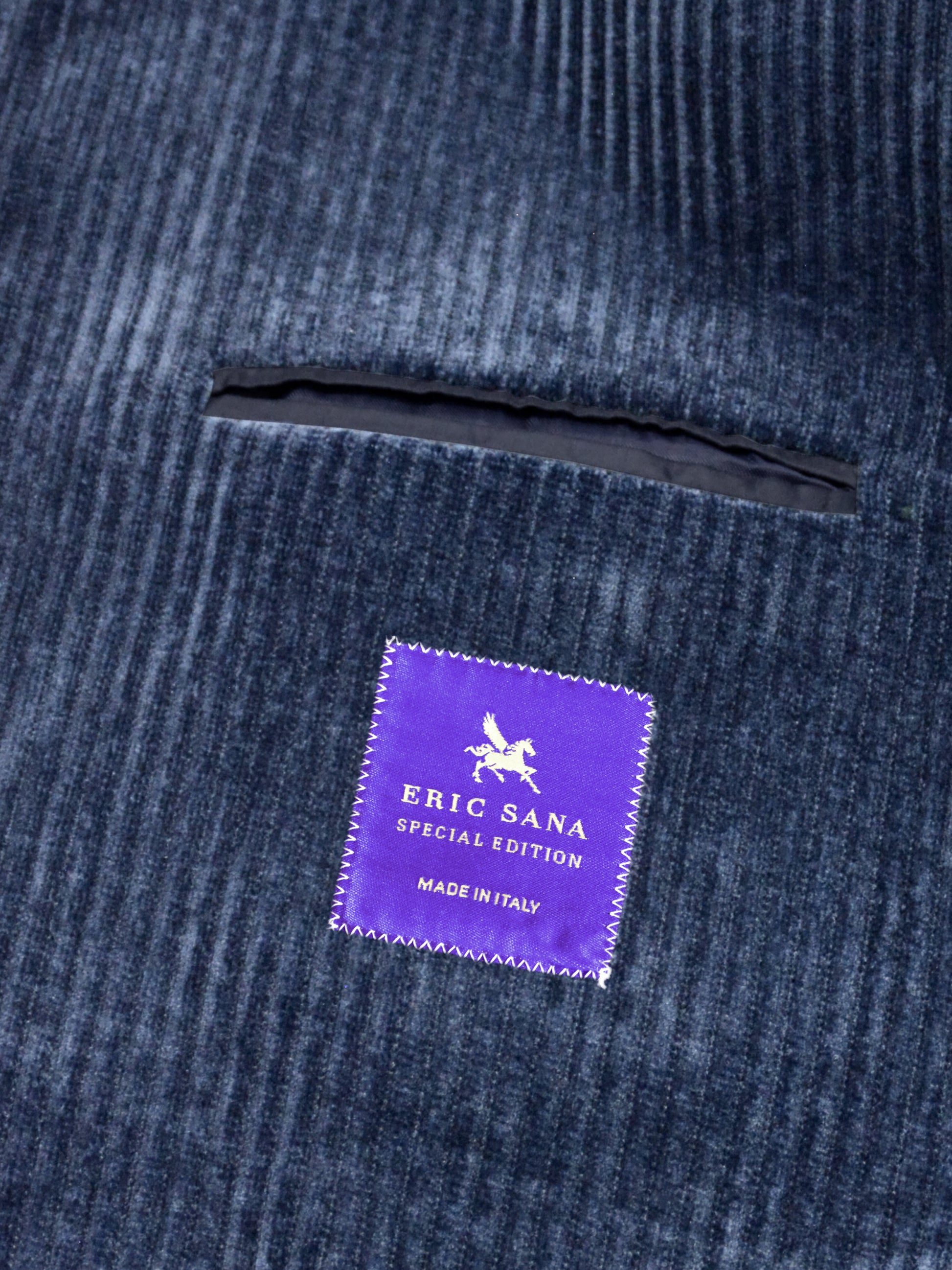 This stylish corduroy jacket Made in Italy - is a vintage inspired utility or safari style design. The fabric is a soft, ribbed corduroy in a muted sage green (salvia) and blue gray (nimbus) colour, giving it a rich texture and a slightly rugged yet sophisticated look.It has a tailored structure with a notched lapel, four button front closure and two buttoned chest pockets with flap closures, adding a functional and military-style aesthetic.