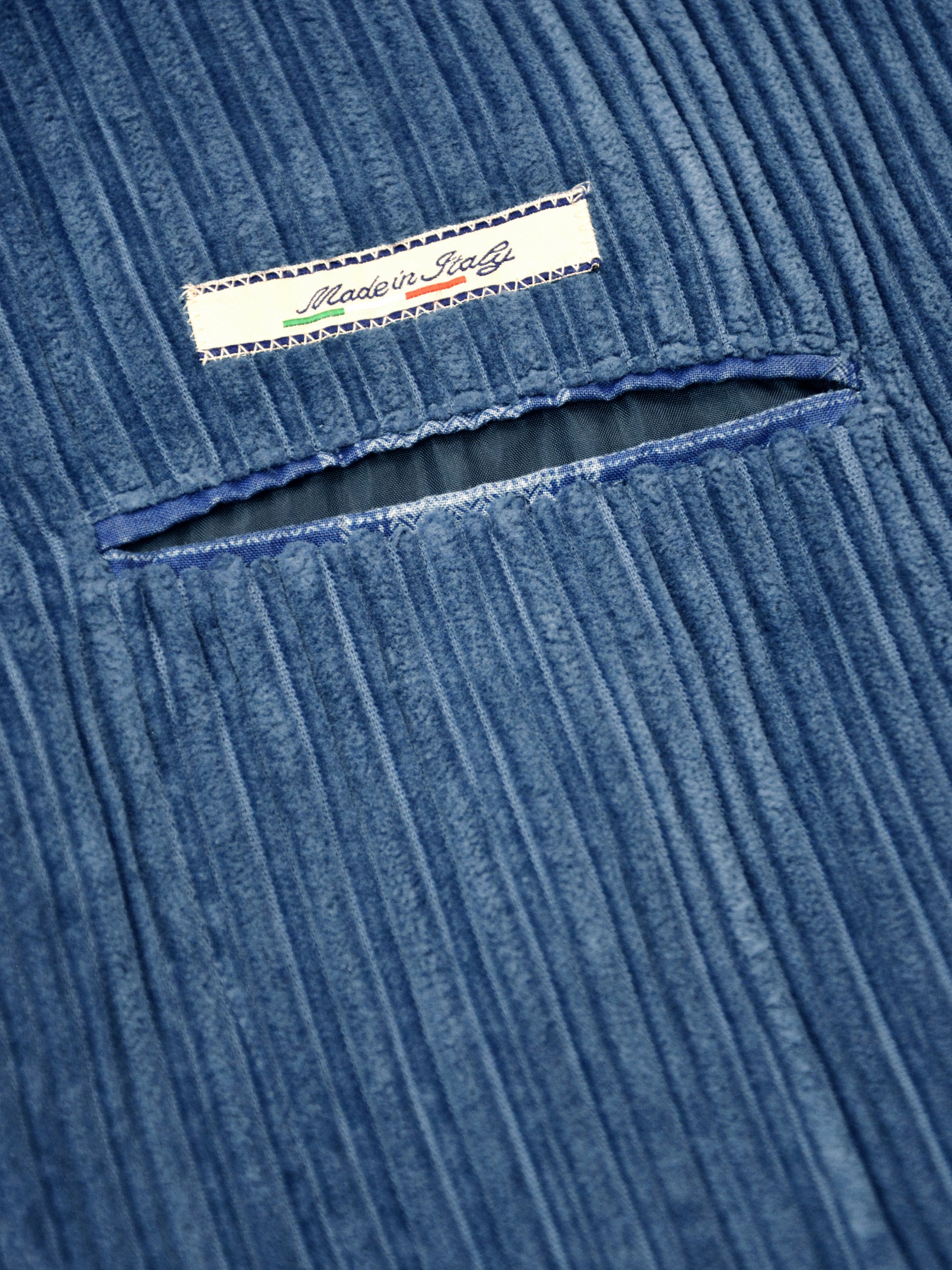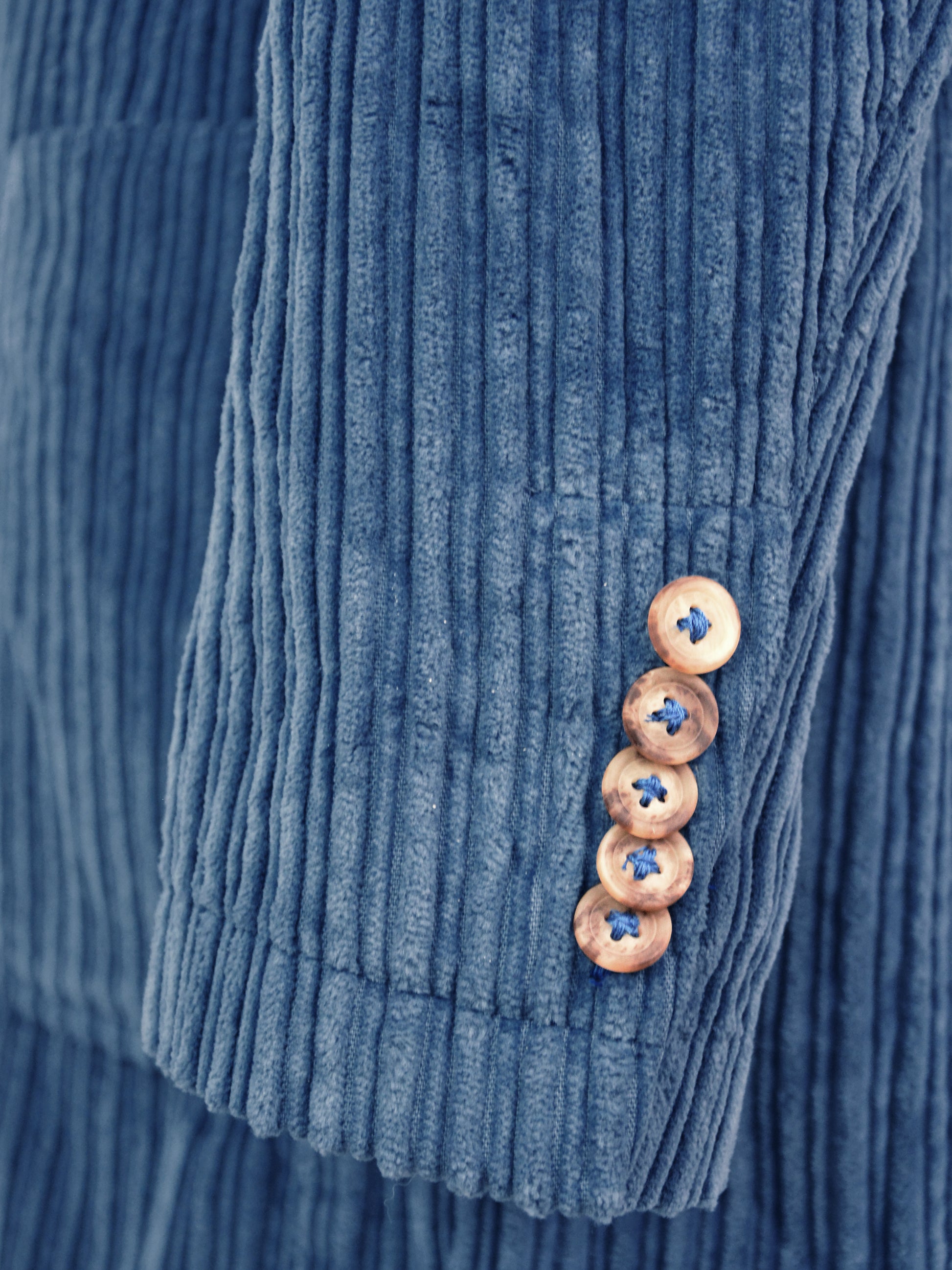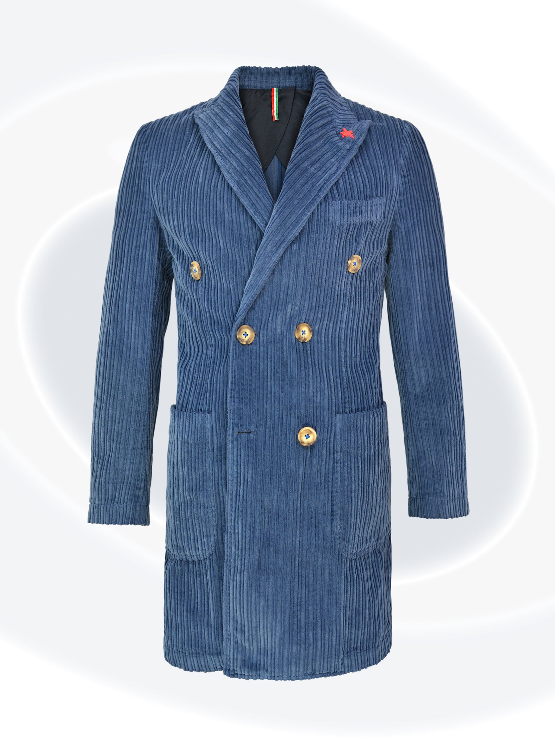 This Long Coat Cotton Velveteen is made of high-quality, textured corduroy, giving it a luxurious look and feel. The double-breasted design with peak lapels and six button front closure adds to its timeless style, while the large patch pockets provide a touch of functionality. The intricate detailing on the cuffs, with five decorative buttons, further enhances the overall refined and sophisticated appearance of this coat.