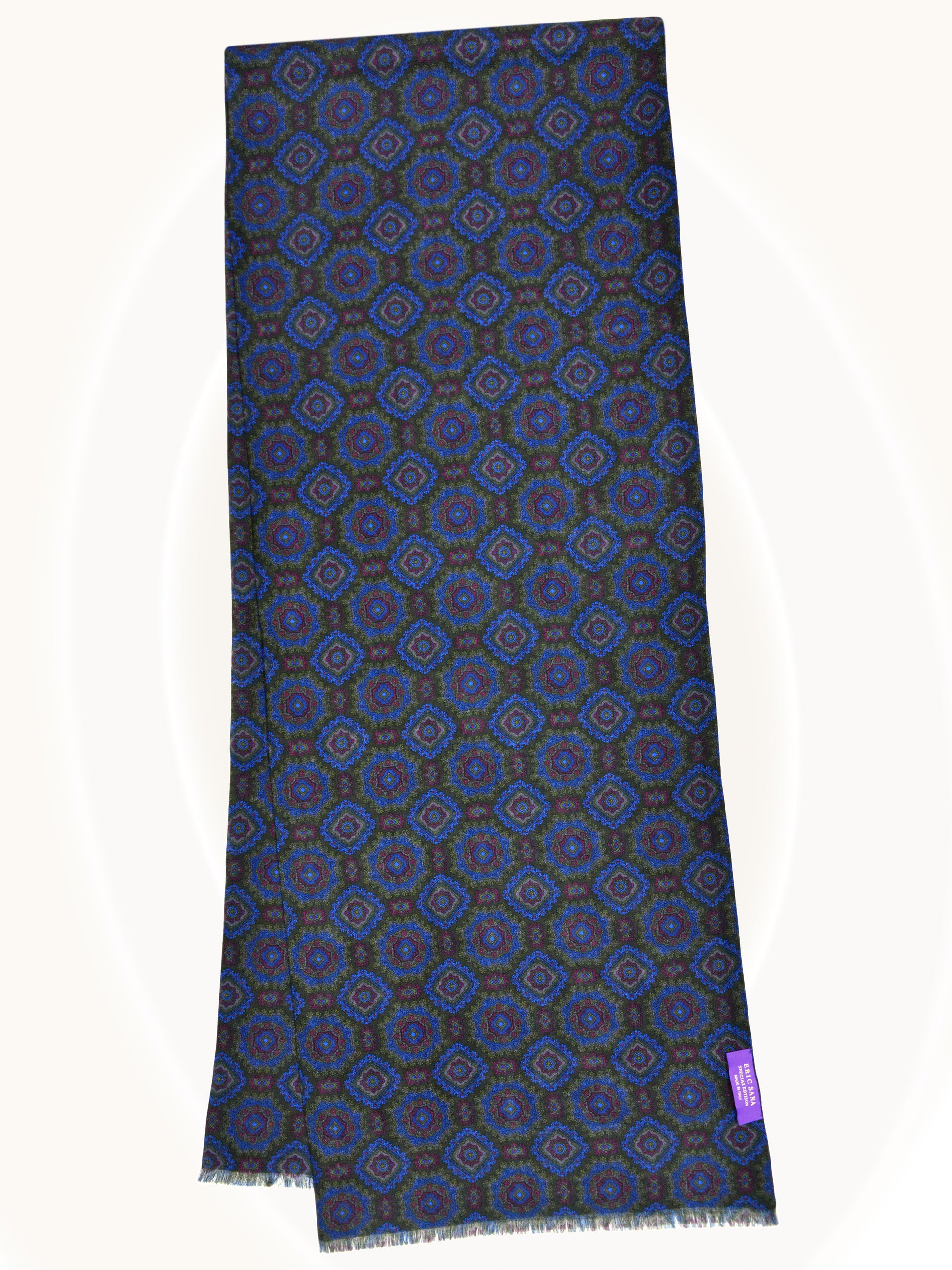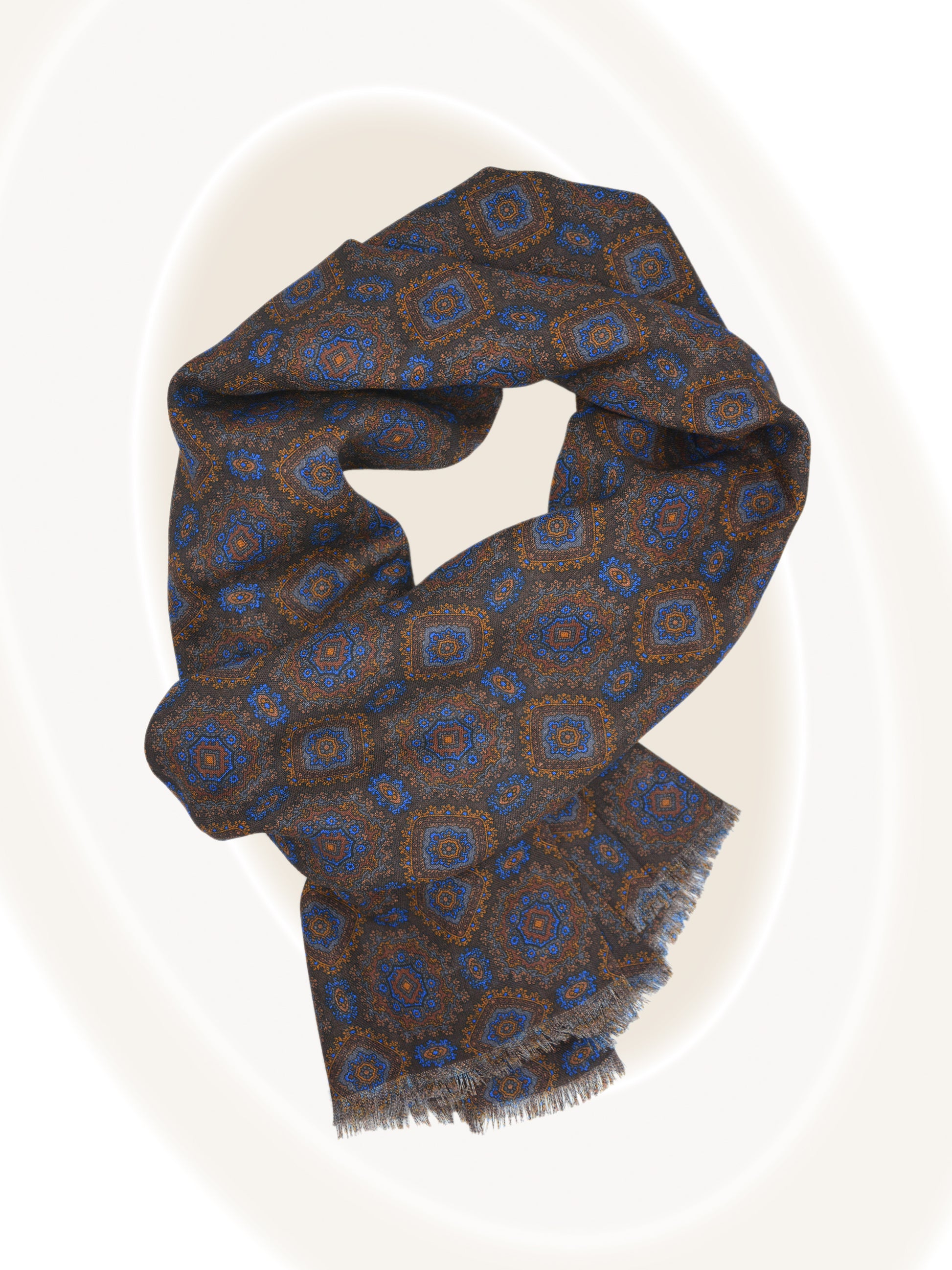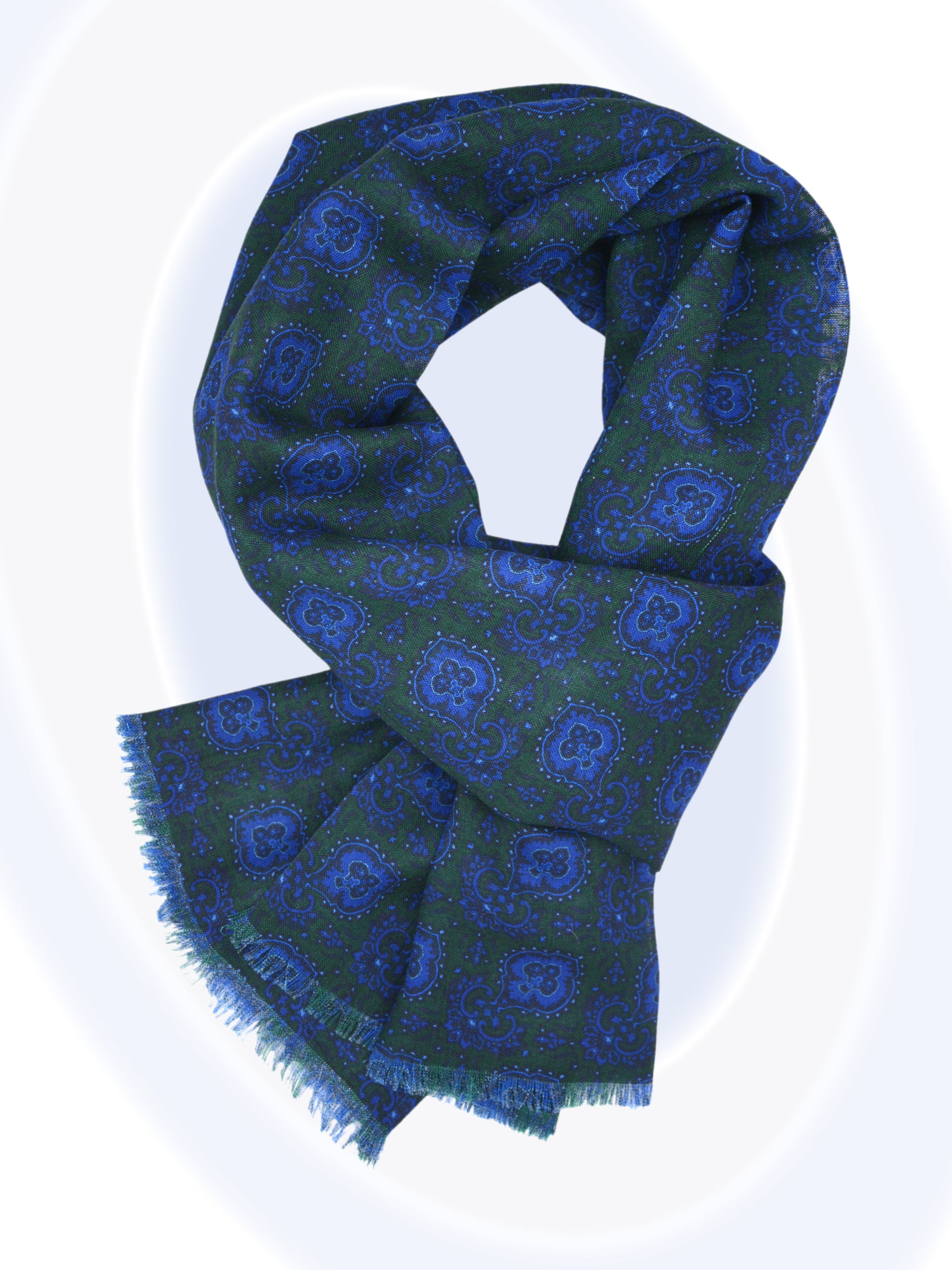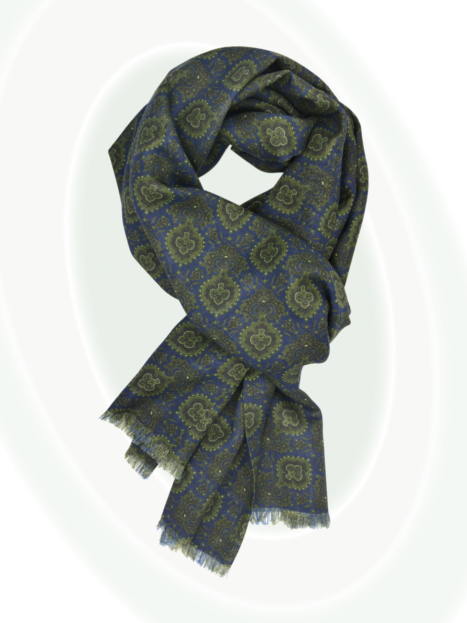 These wool scarves feature rich intricate patterns with a distinct classic vintage -inspired aesthetic. The prints are a mix of paisley, geometric motifs and bandana inspired, commonly found in traditional Italian or English menswear accessories.