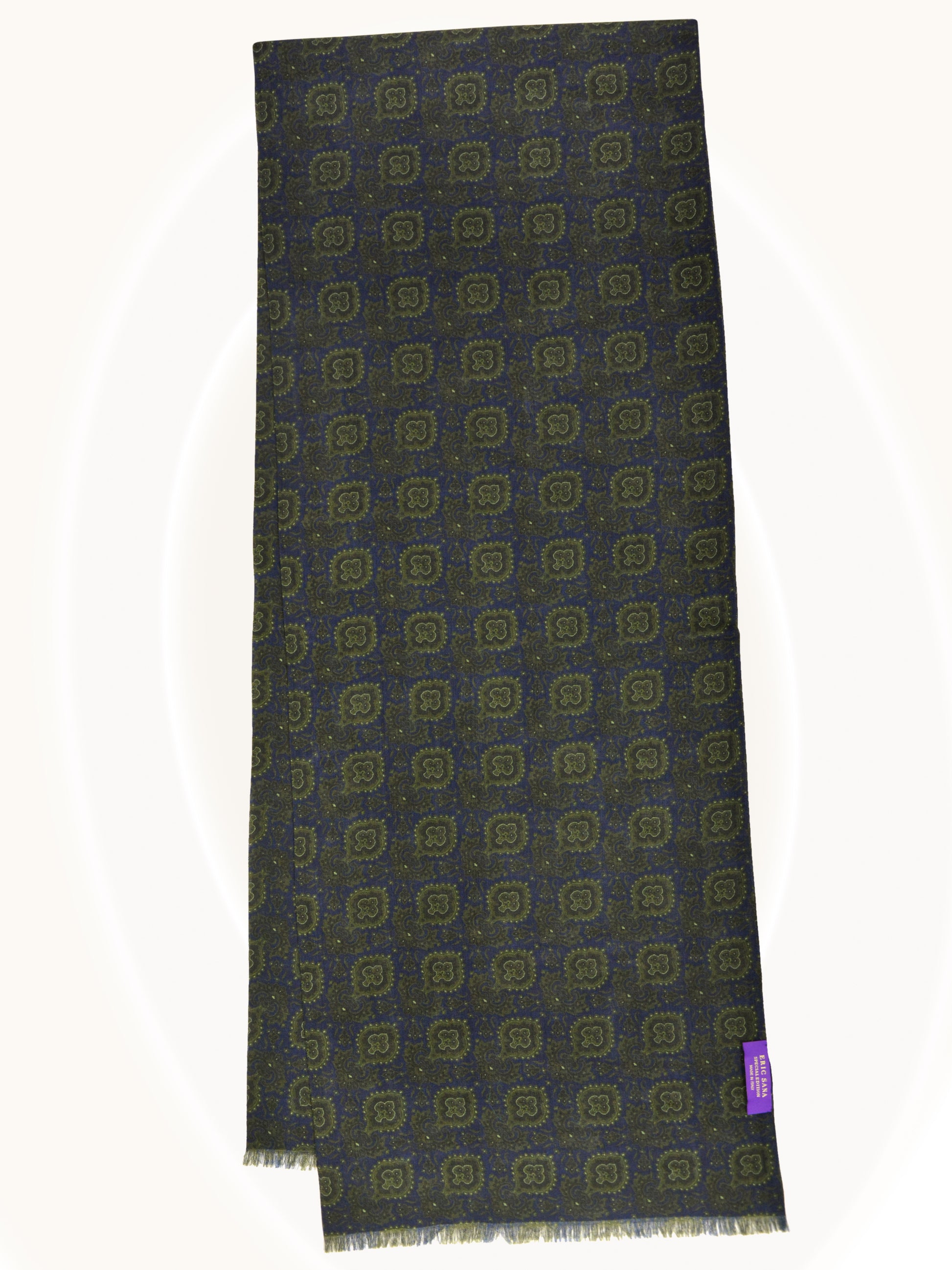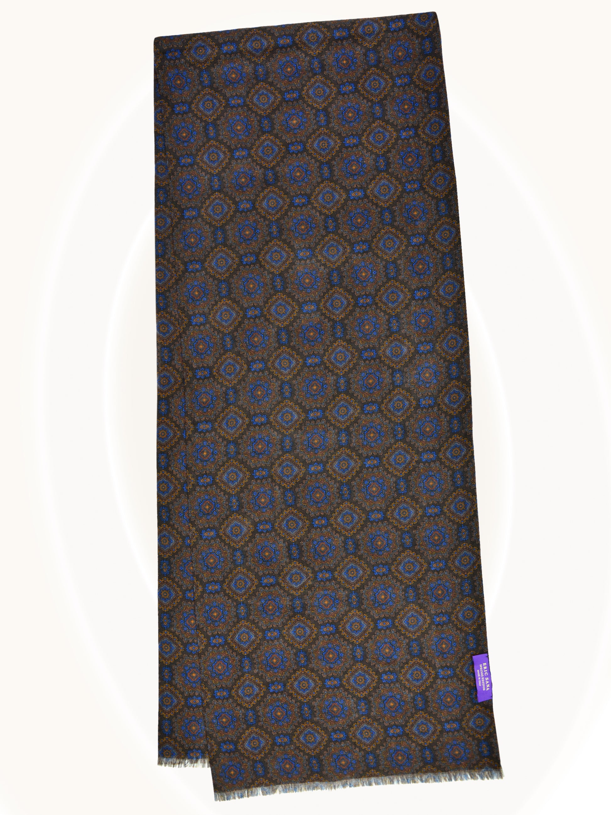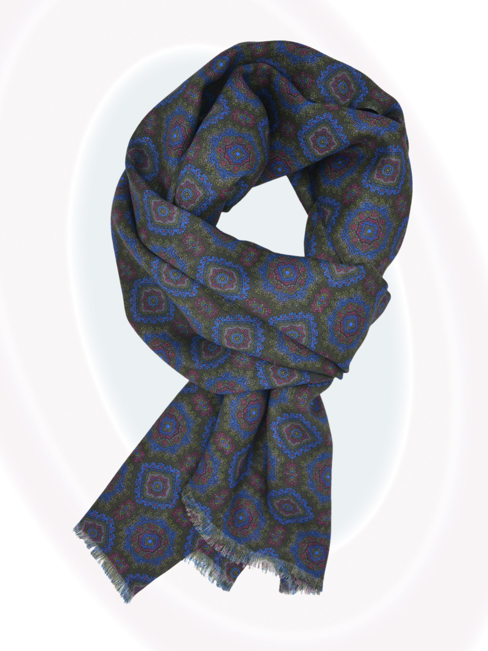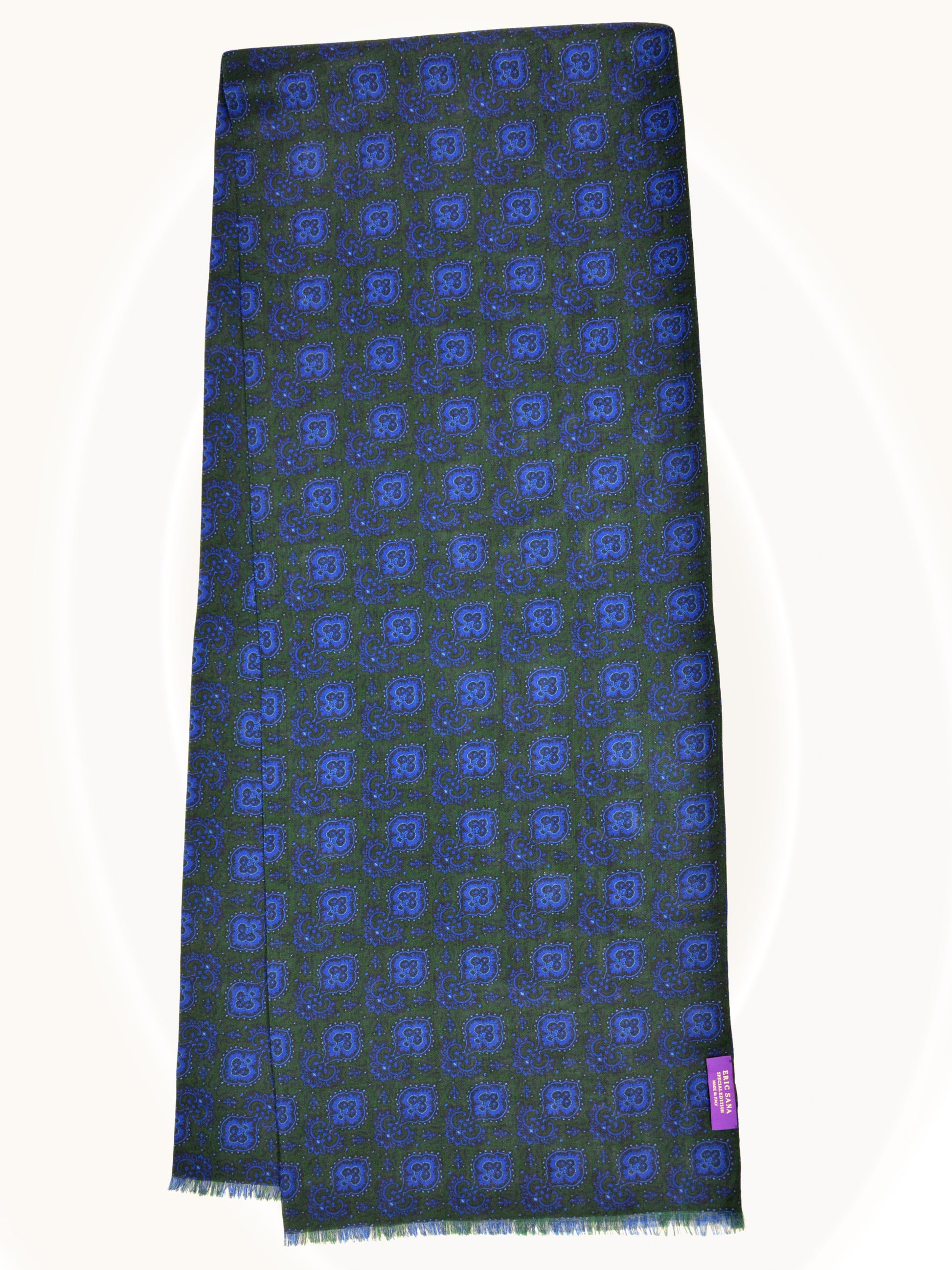 These wool scarves feature rich intricate patterns with a distinct classic vintage -inspired aesthetic. The prints are a mix of paisley, geometric motifs and bandana inspired, commonly found in traditional Italian or English menswear accessories.