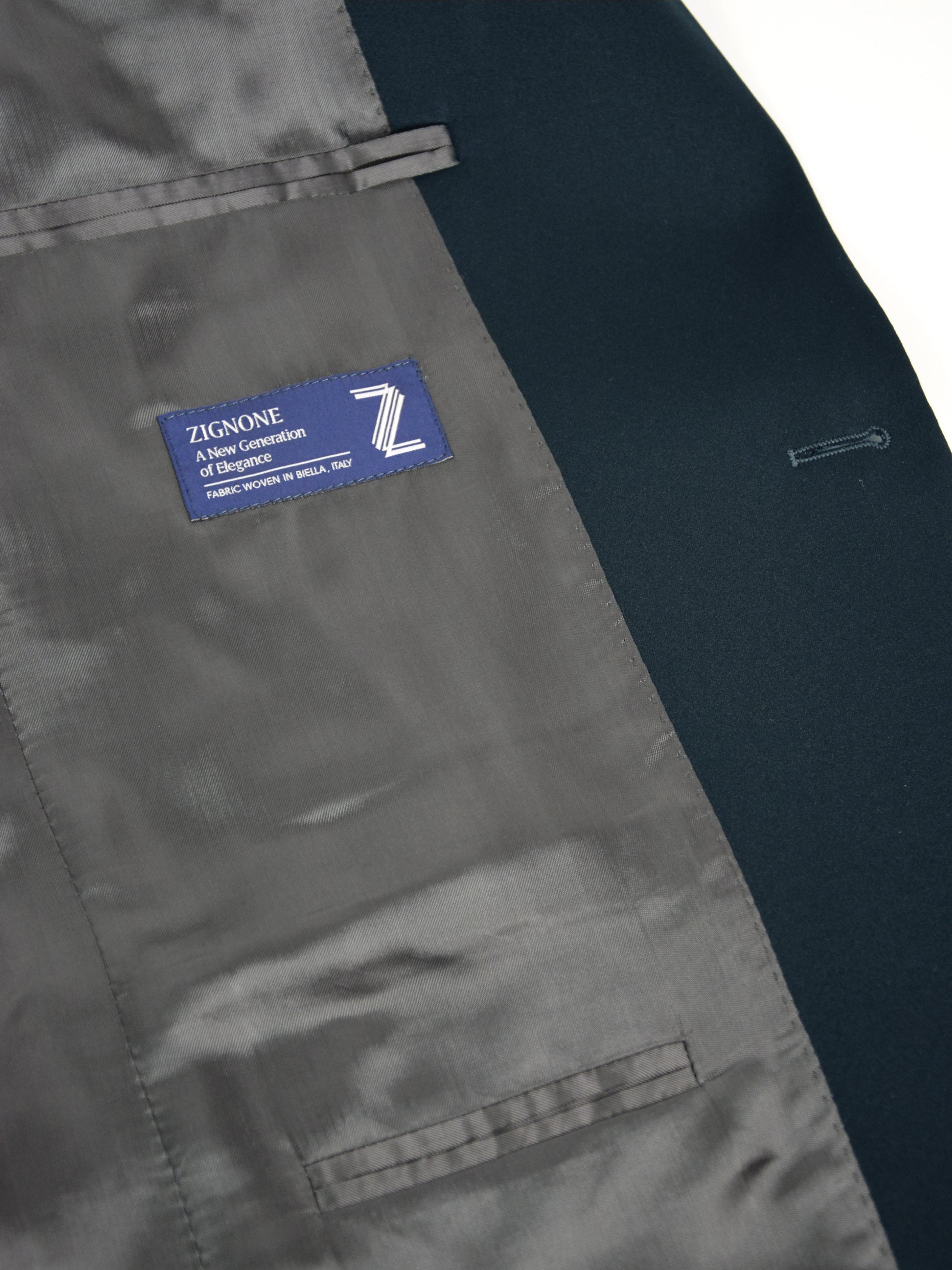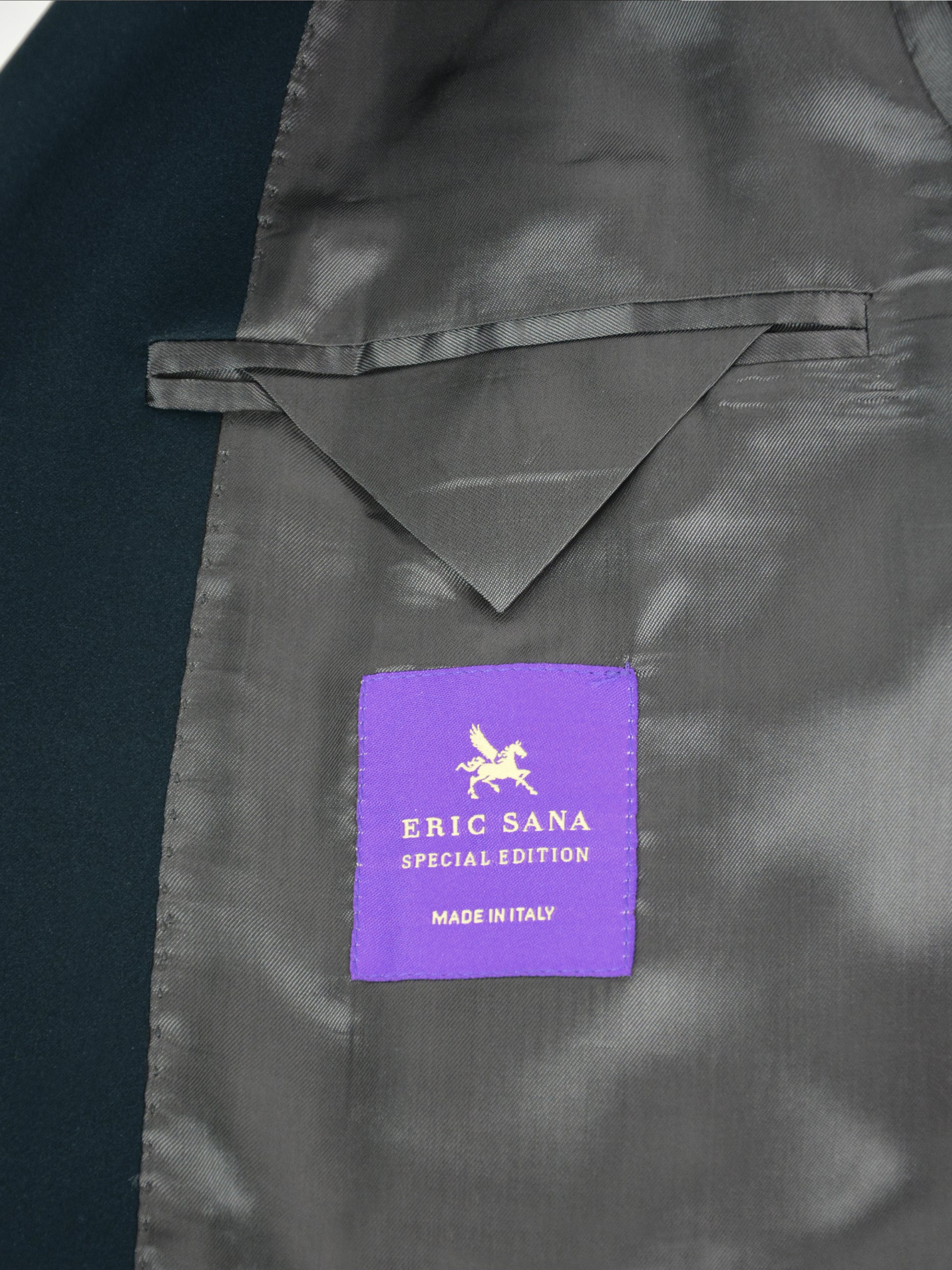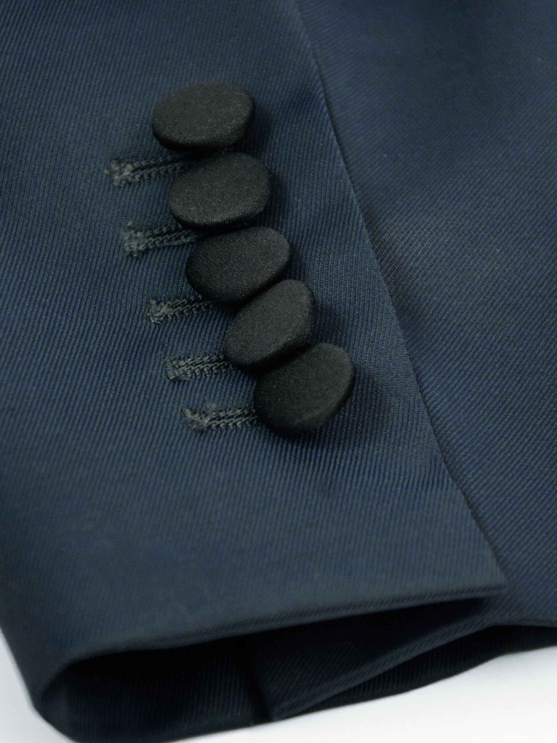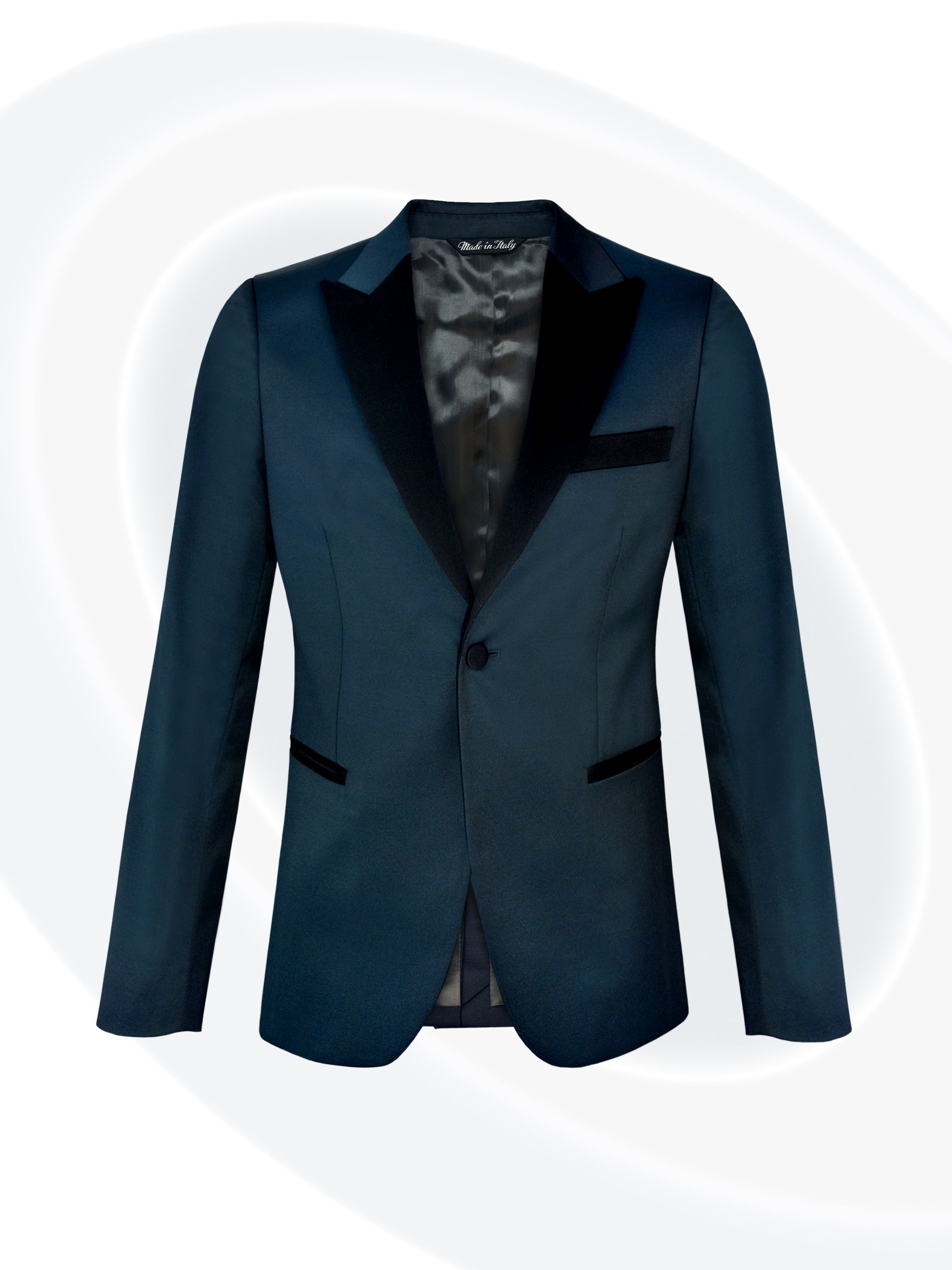 This Sapphire Tuxedo boasts a sophisticated and elegant design with a muted bluish-green hue and subtle sheen that exudes a refined and modern aesthetic. The lapels and pocket trims are accented with contrasting black satin, giving it a touch of classic style. Crafted from a blend of polyester, virgin wool, and elastane, this fabric offers a perfect balance of durability, comfort, and slight stretch for ease of movement. Its single-breasted design features a single button closure and covered buttons on the sleeves, adding a touch of formality and luxury.
