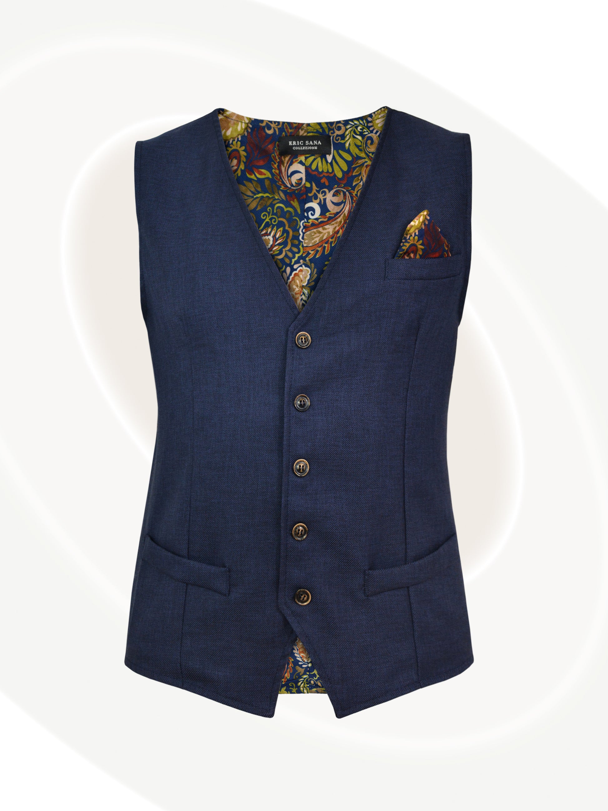 Luxury meets sophistication in this two-tone paisley vest. It features a five button fastening front, adjustable back strap for a flattering fit, and a mix of premium polyester and cotton with inner lining for a comfortable wear.